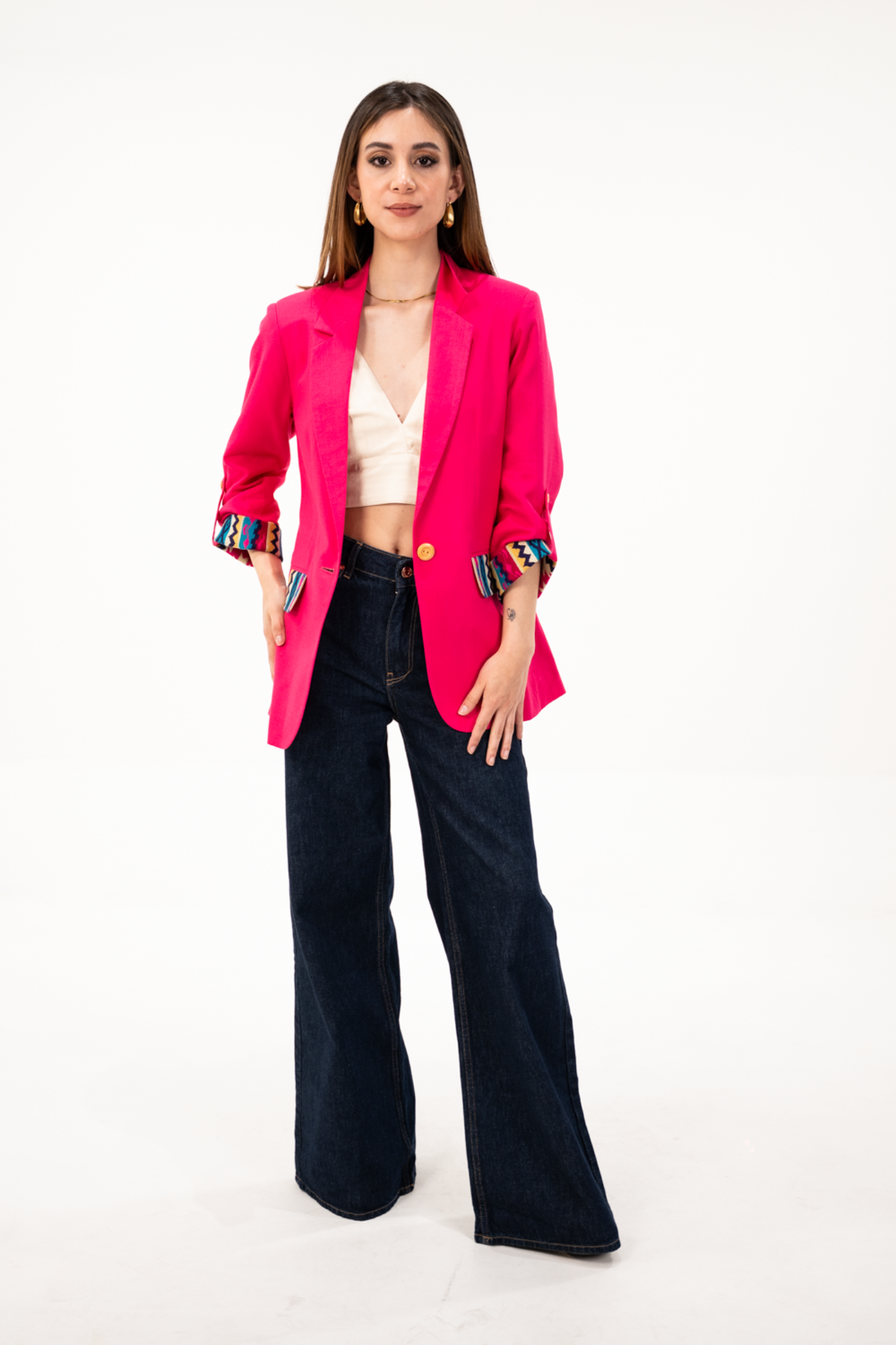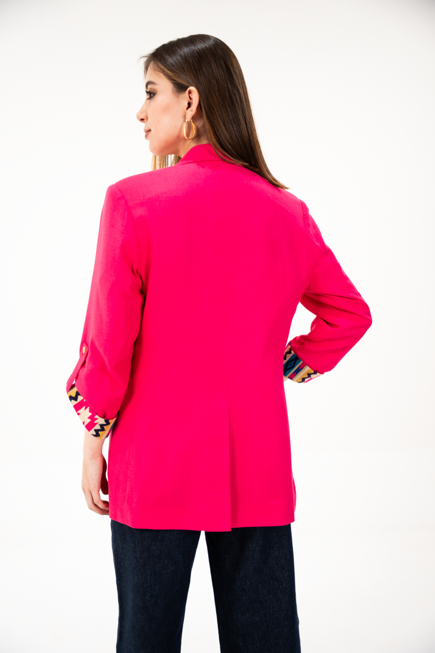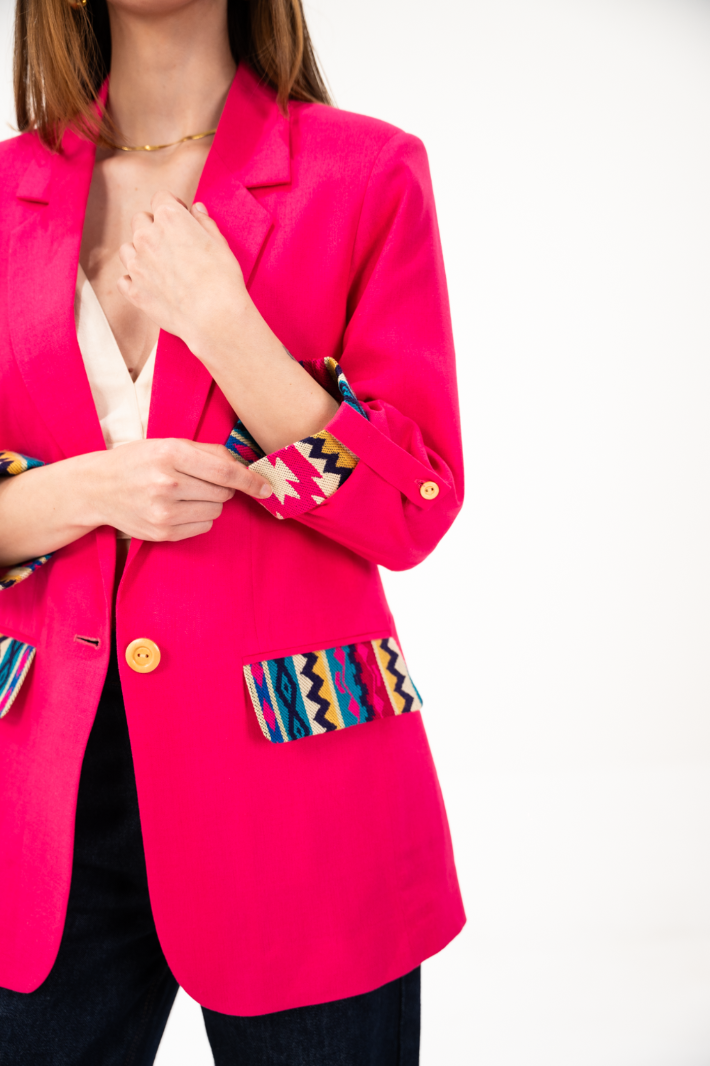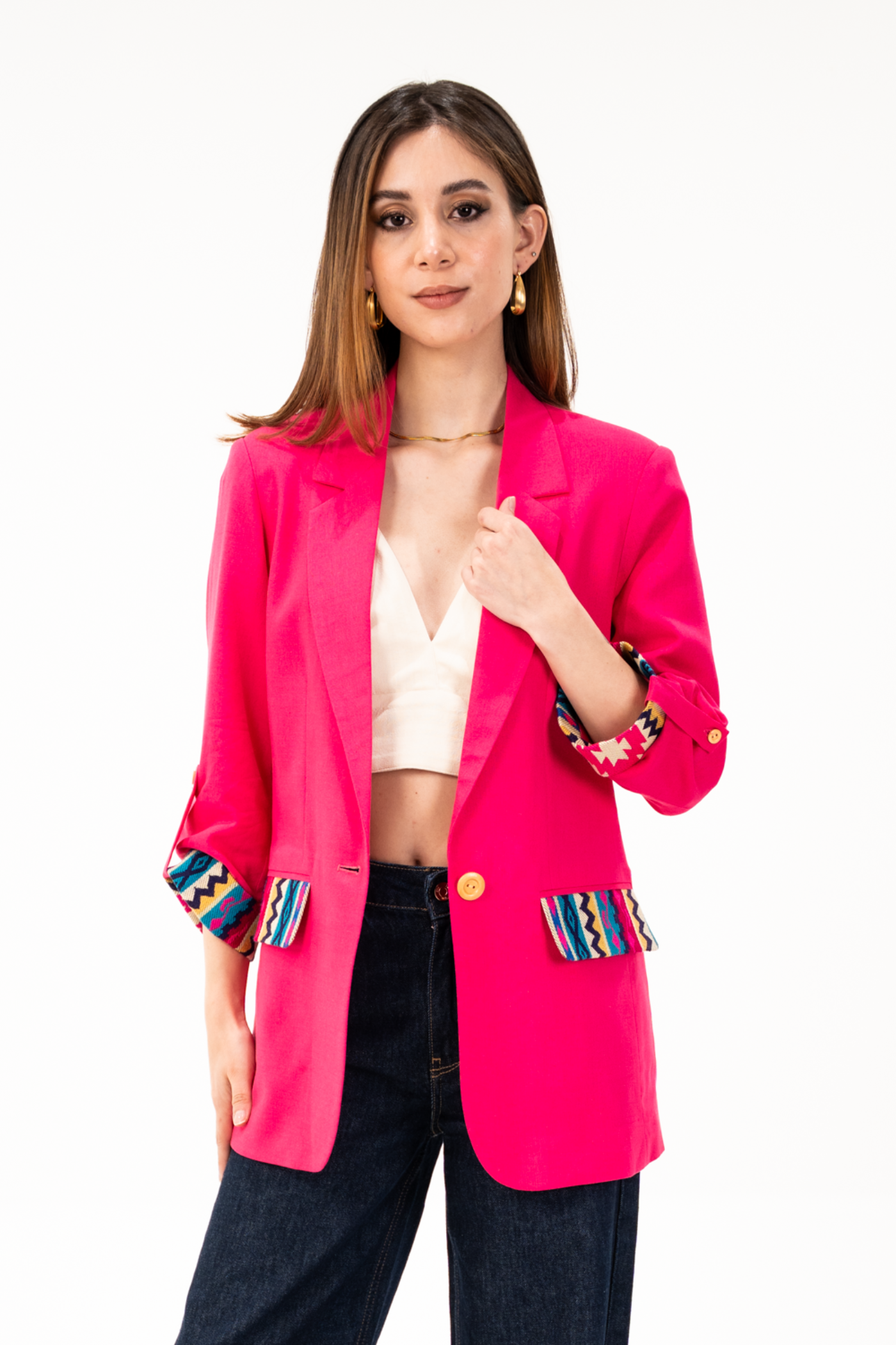Blazer semientallado en tela lino color fucsia con manga recogida, detalle de tejido étnico tonos fucsia/lila en carpetas y borde de mangas, con forro interno.