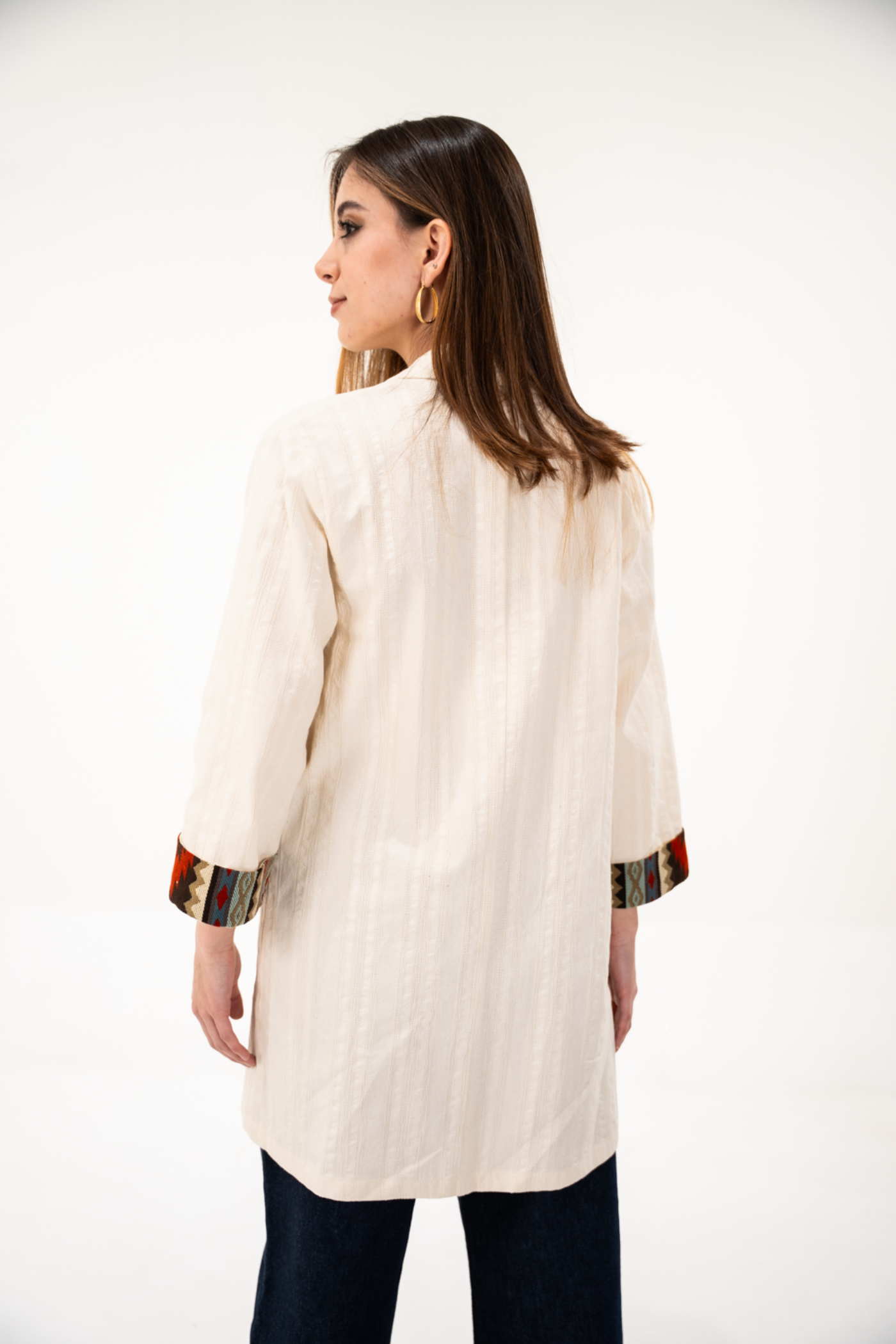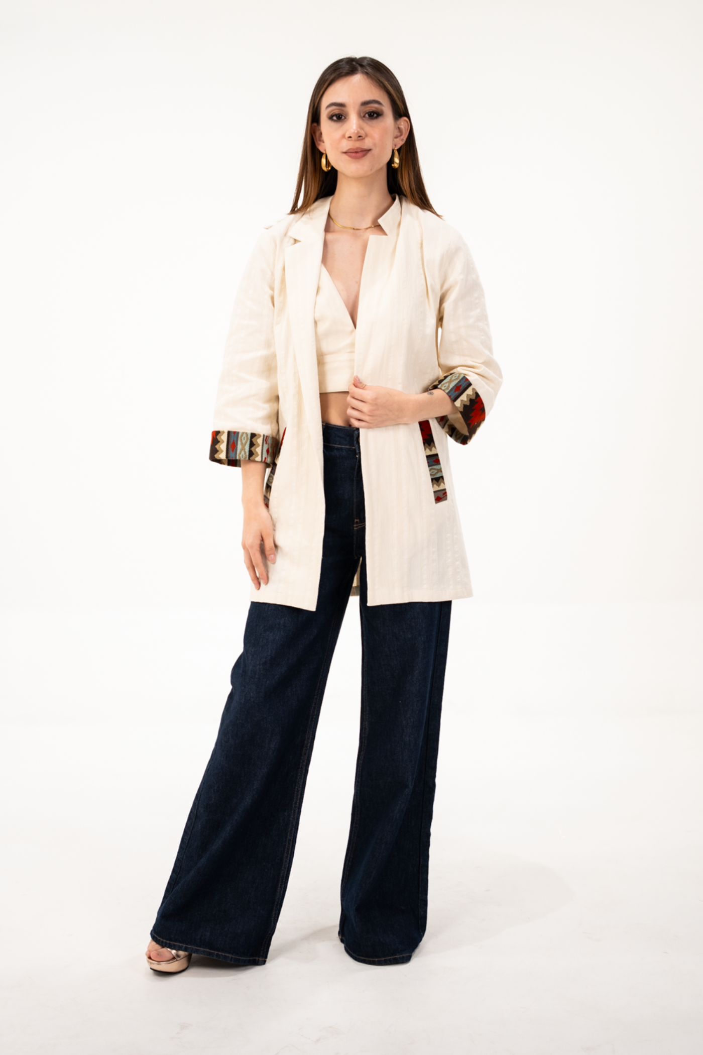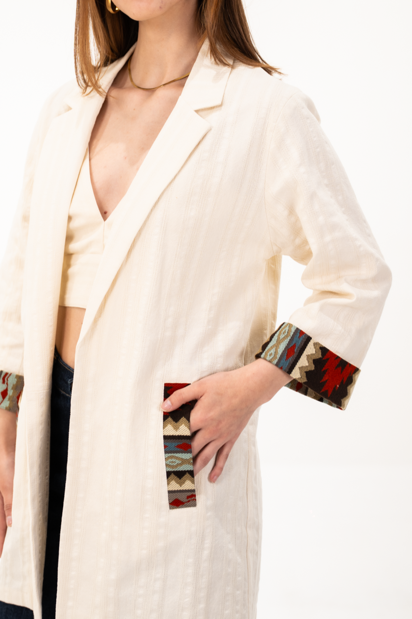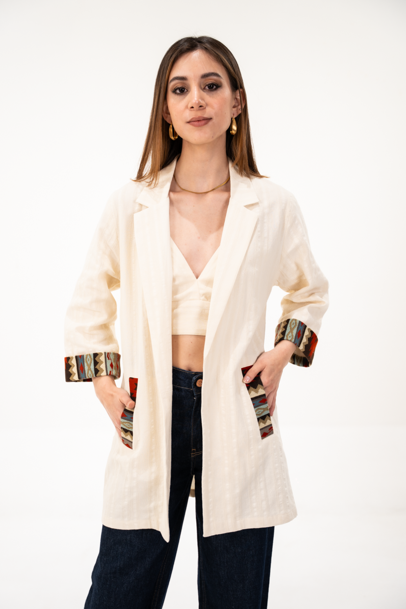 Blazer oversized de tela de algodón con textura color beige, manga 3/4 con detalle de tejido étnico tonos tierra en bolsillos y mangas.