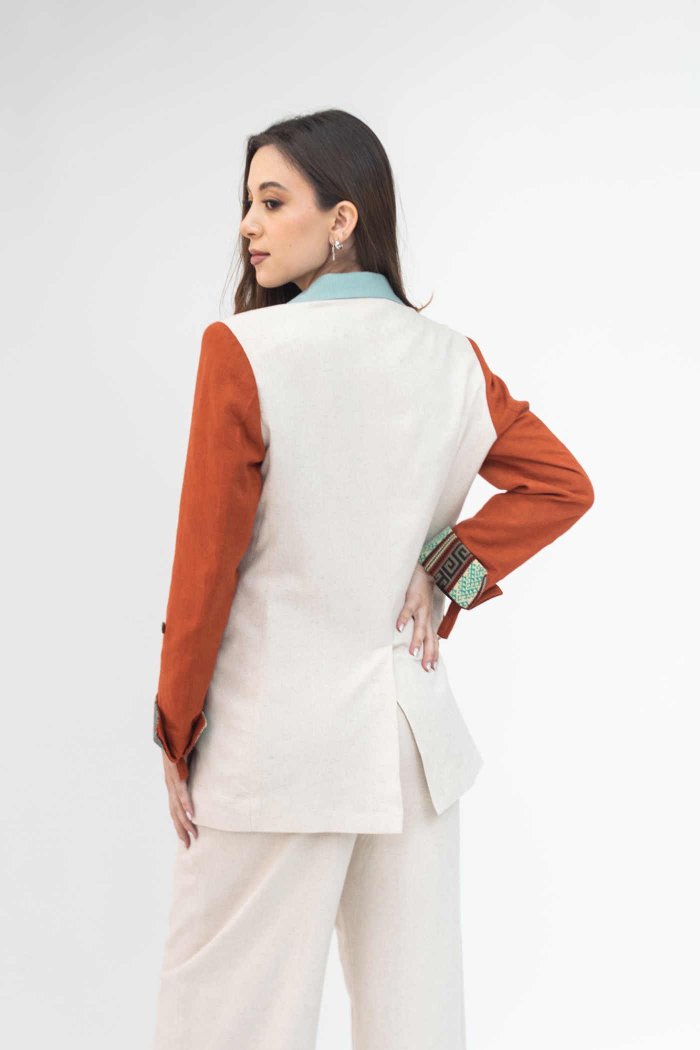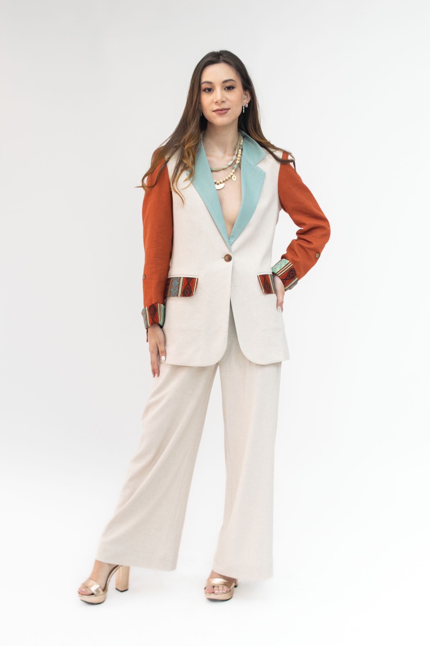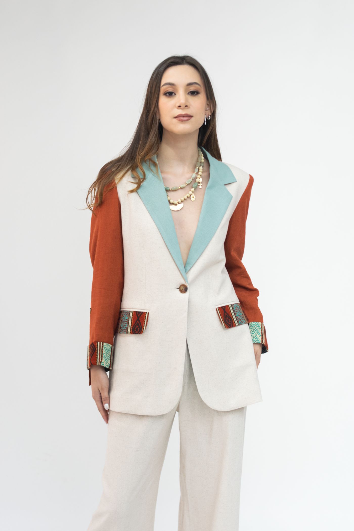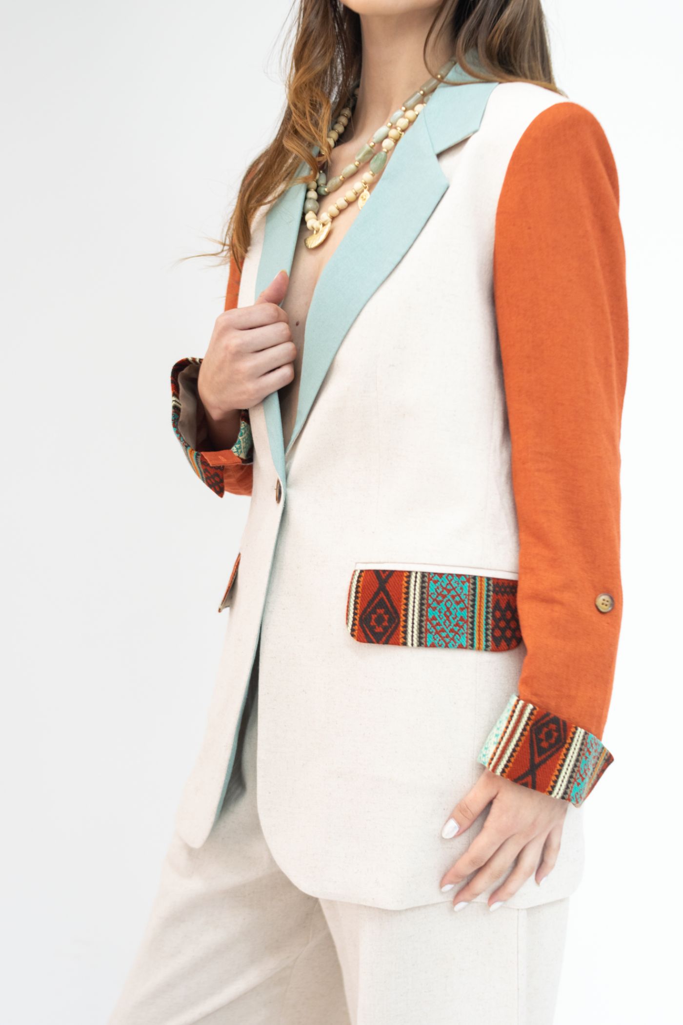 Blazer semientallado de parches de lino colores beige, terracota, menta con manga recogida, detalle de tejido étnico tonos terracota/turquesa en carpetas y borde de mangas, con forro interno.
