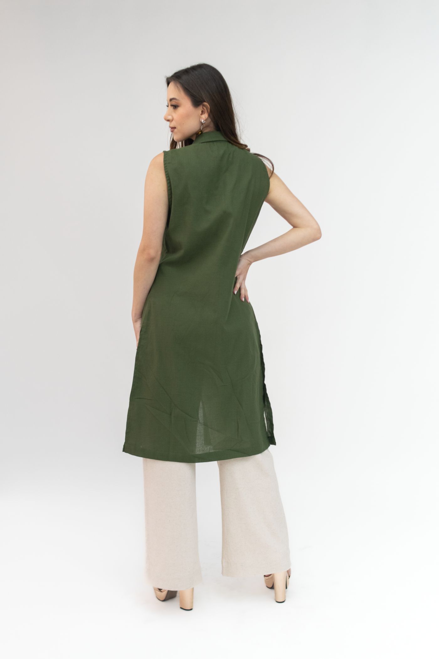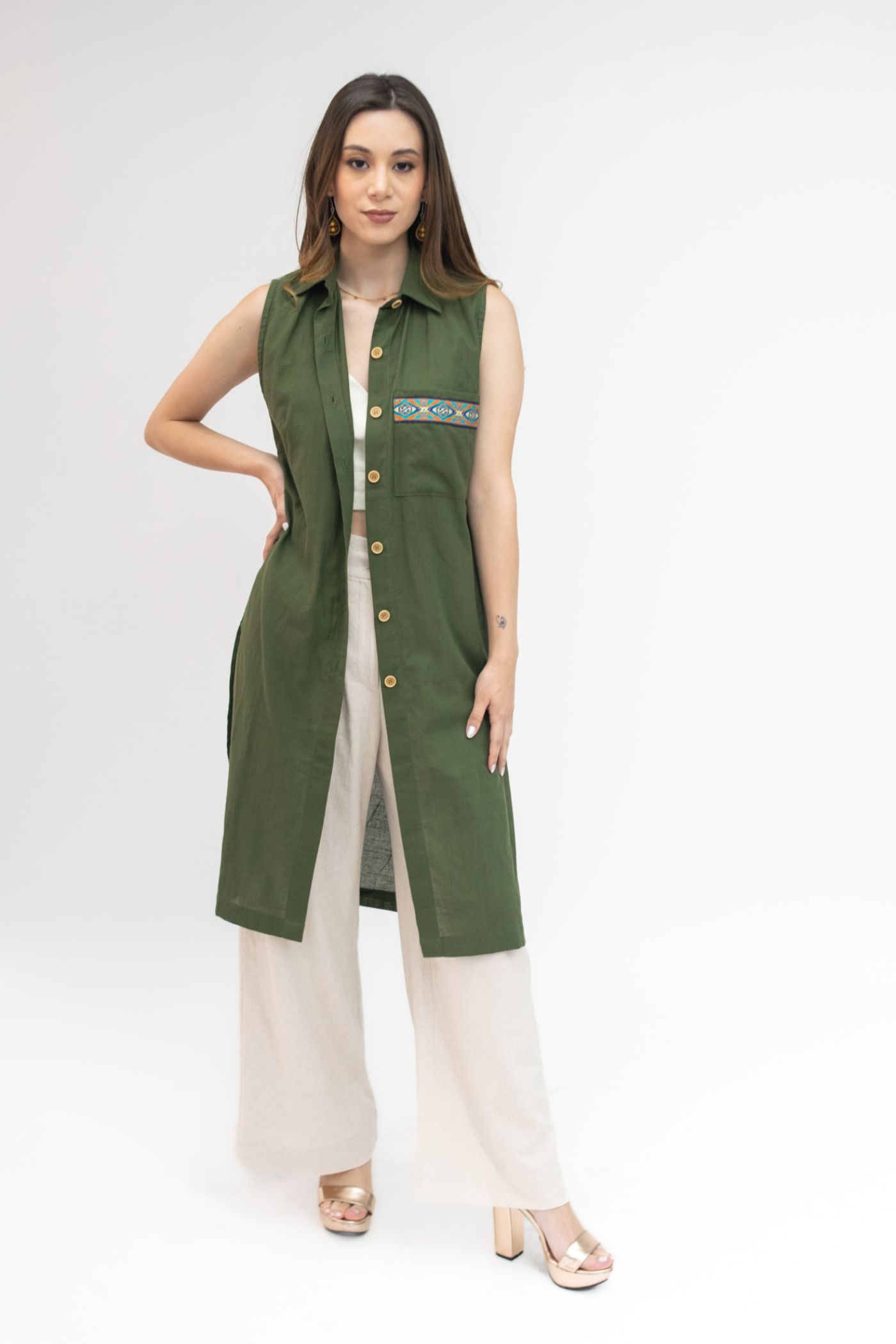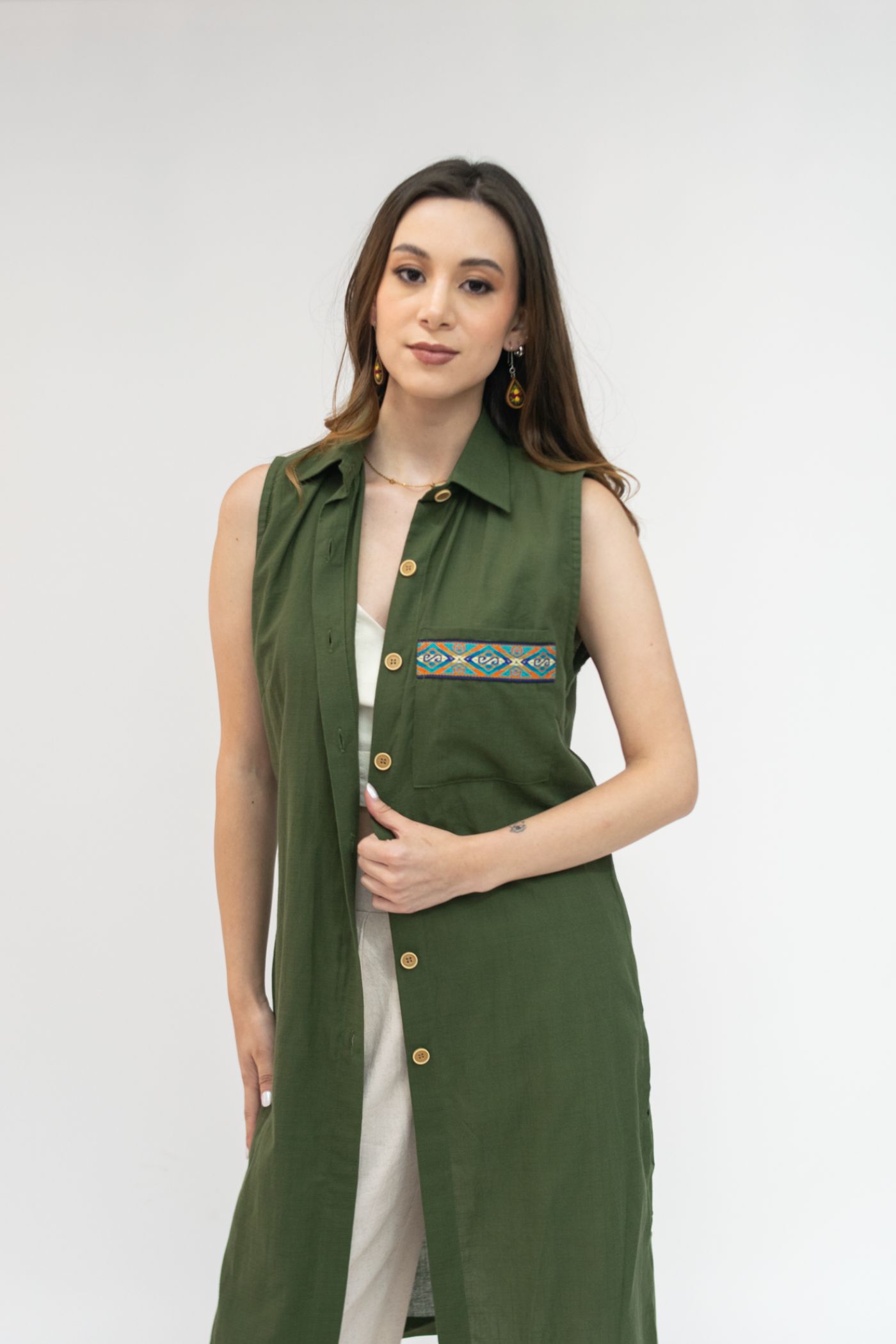 Blusón semientallado en tela de algodón color verde olivo con tejido étnico de telar en bolsillo, con aberturas laterales y botones de carey.