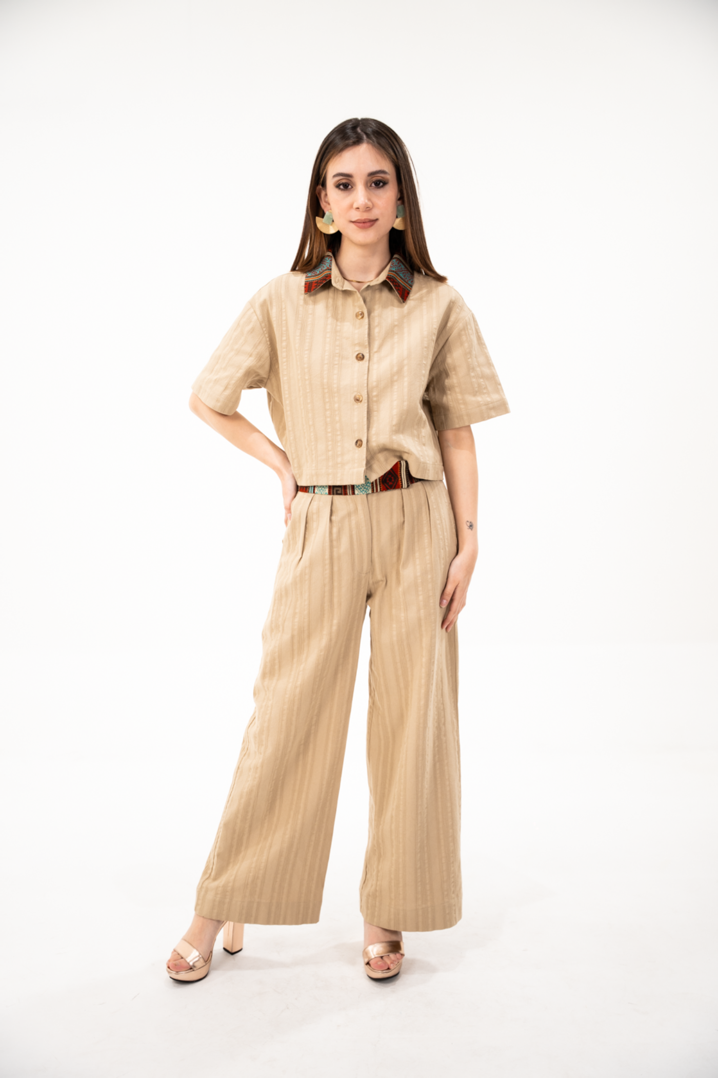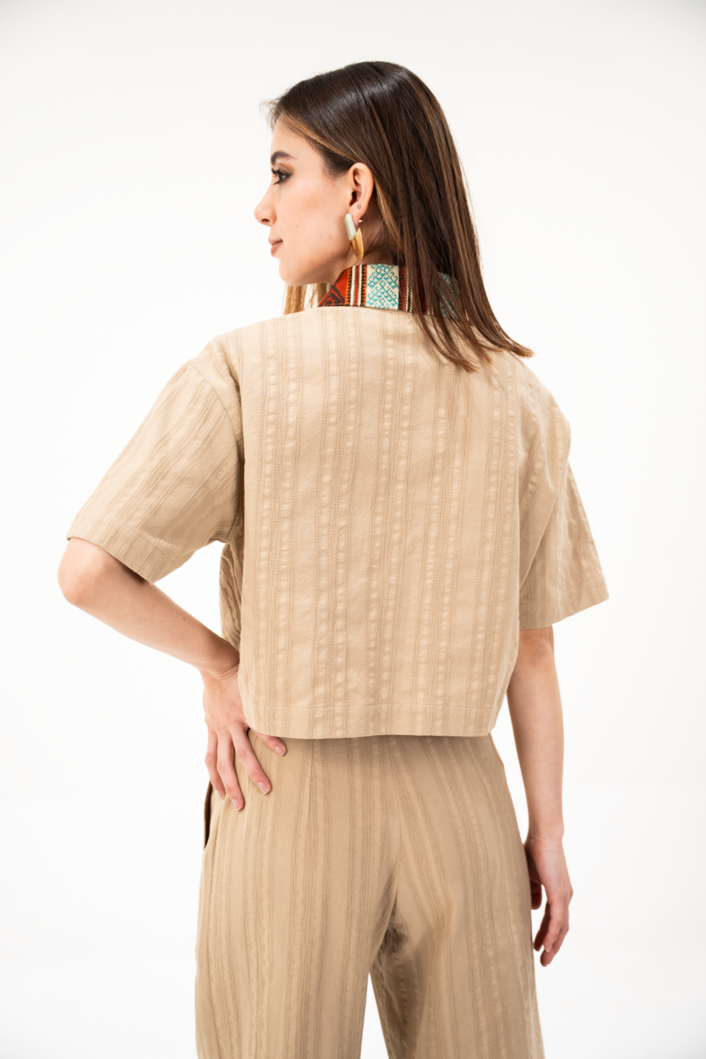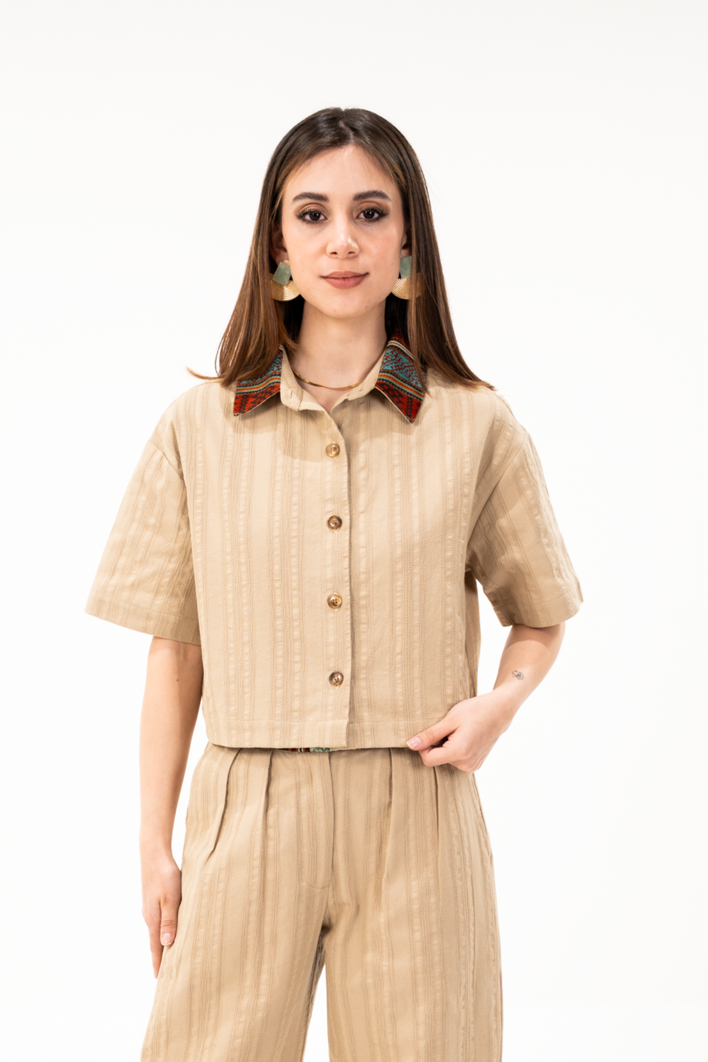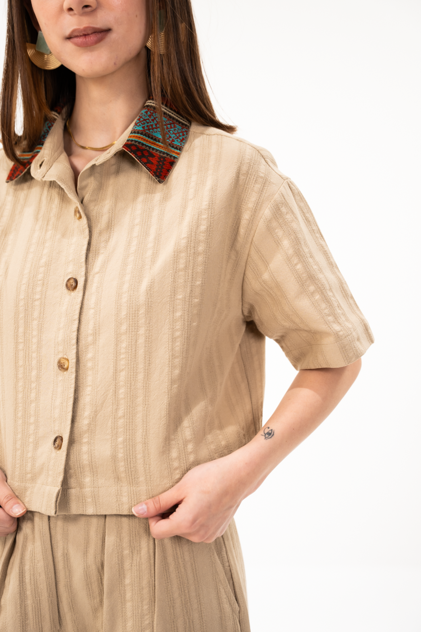 Camisa corta holgada en tela de algodón con textura color caqui, con tejido étnico terracota/turquesa en cuello.