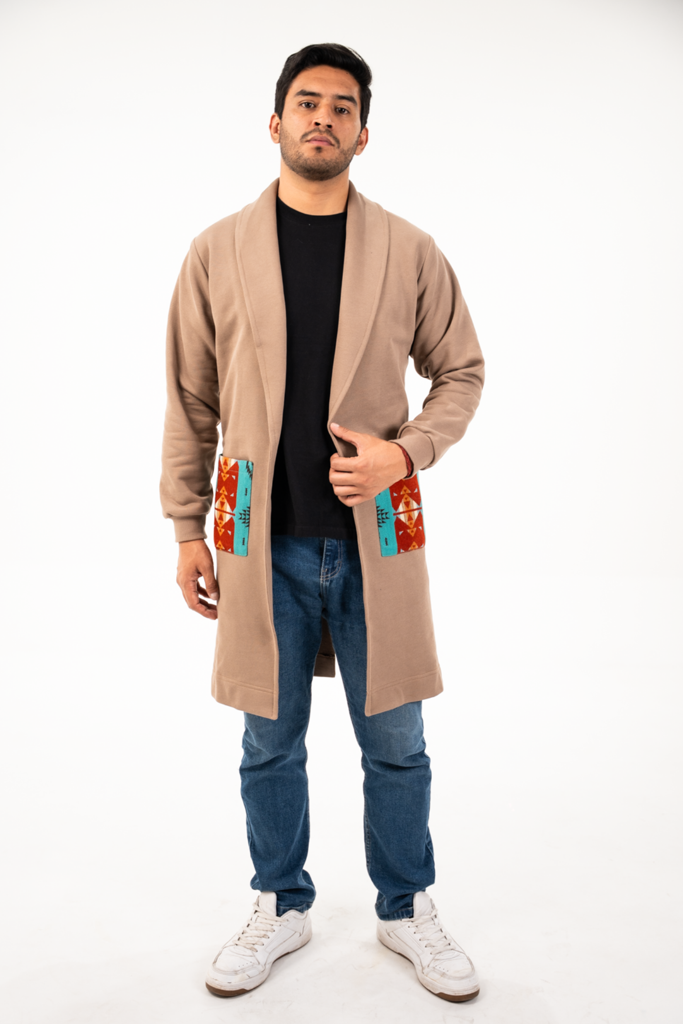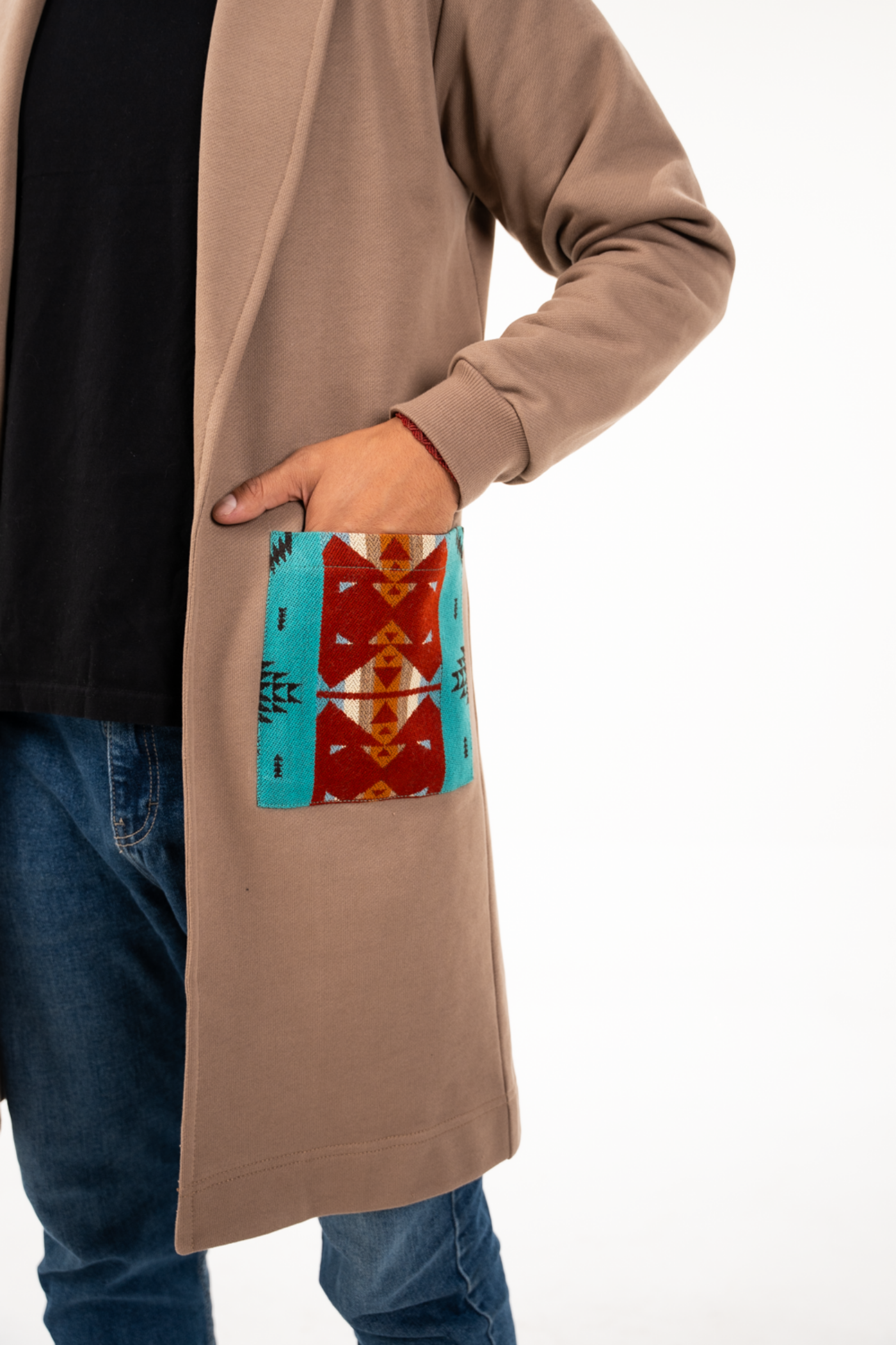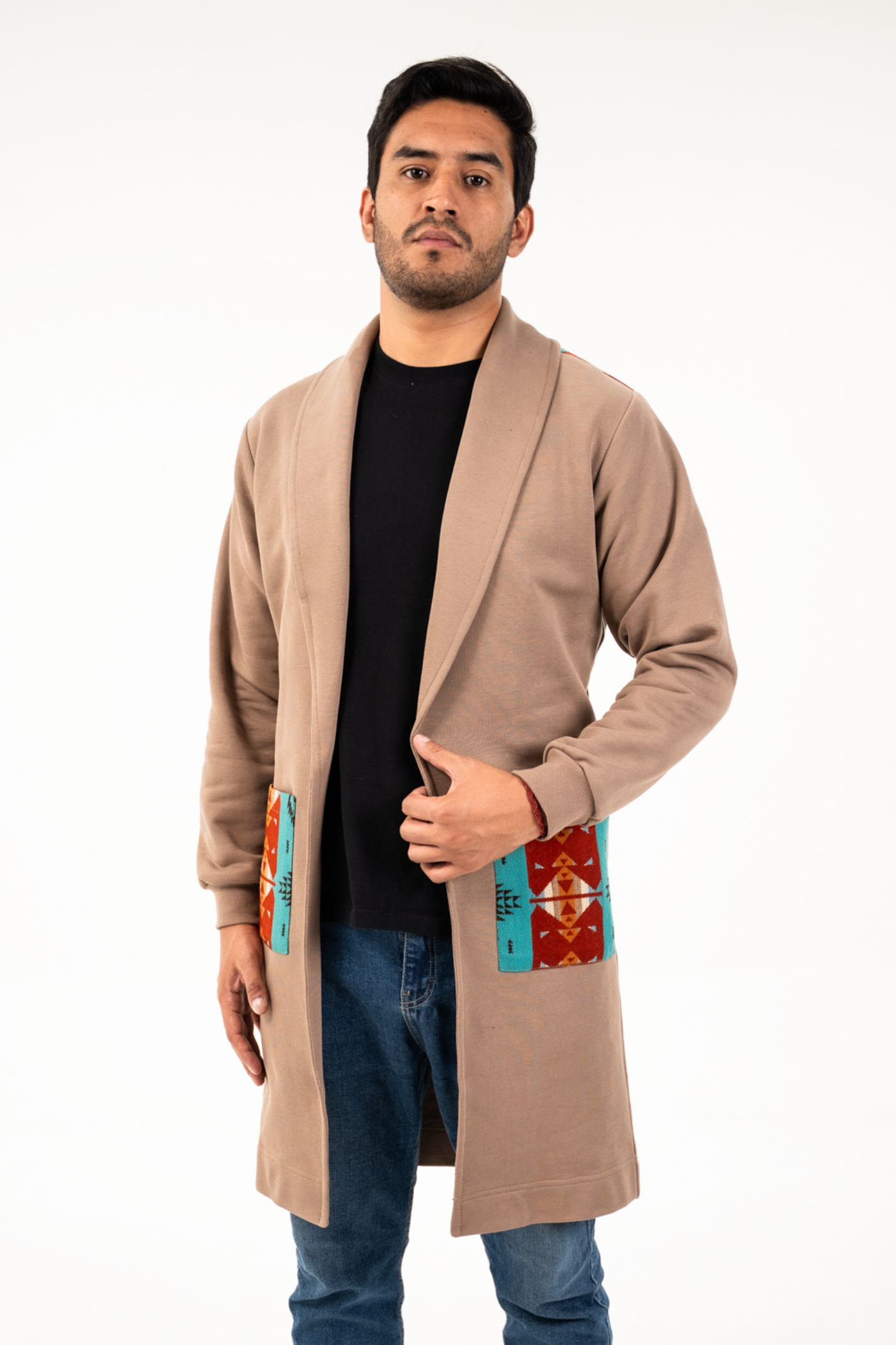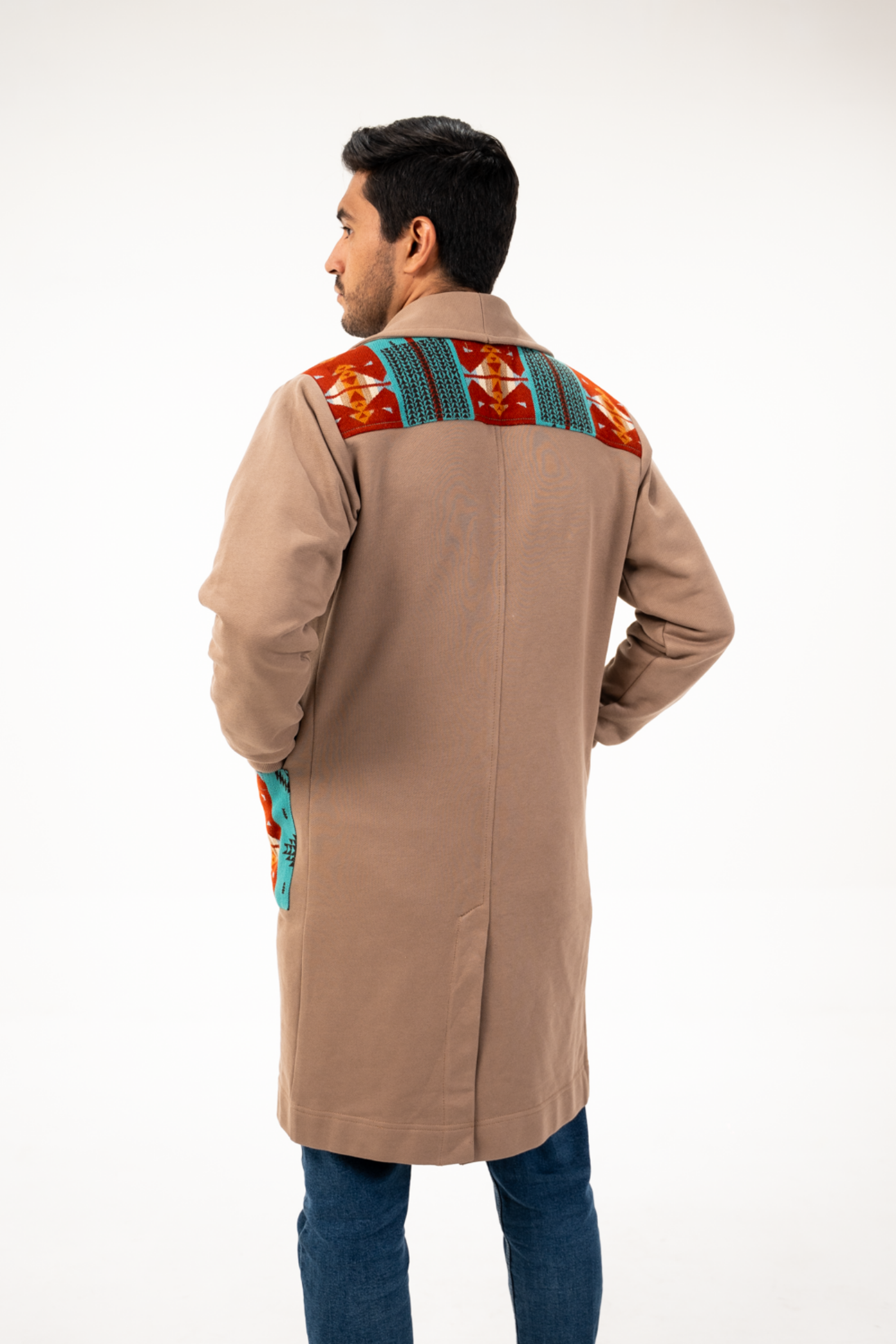 Cardigan seminetallado de tela de agodón color caqui, con tejido étnico tonos turquesa/terracota en bolsillos parches frontales y espalda.