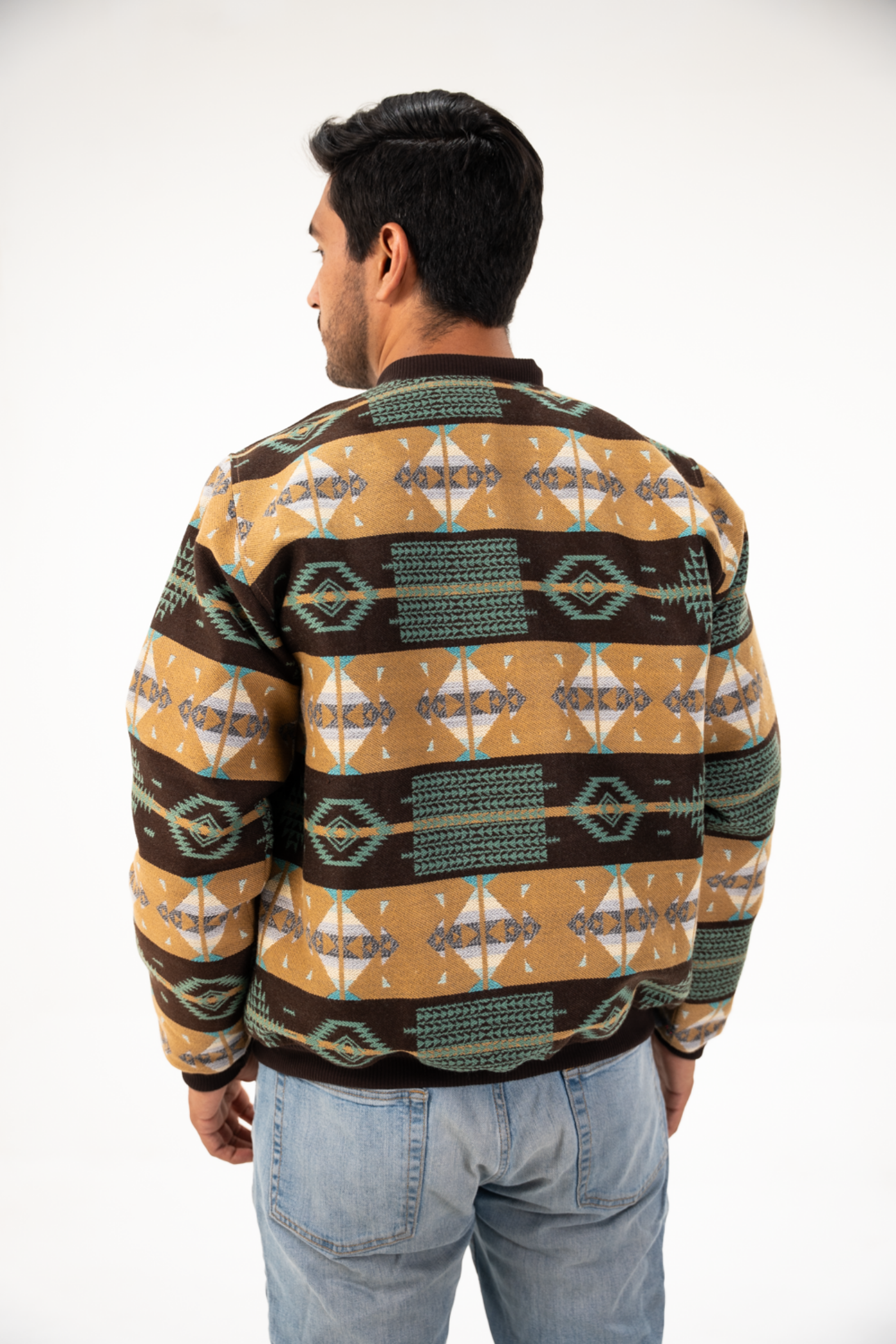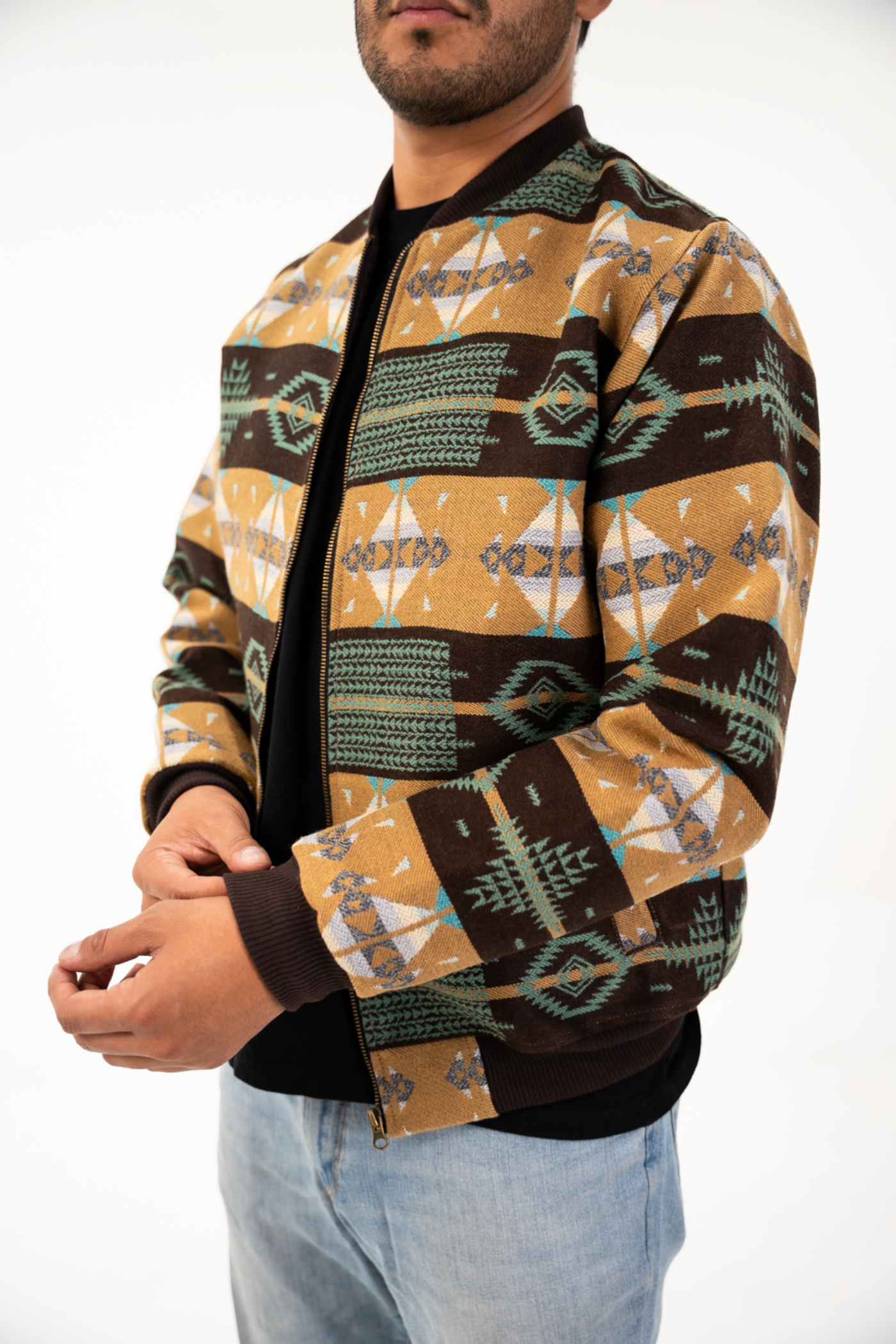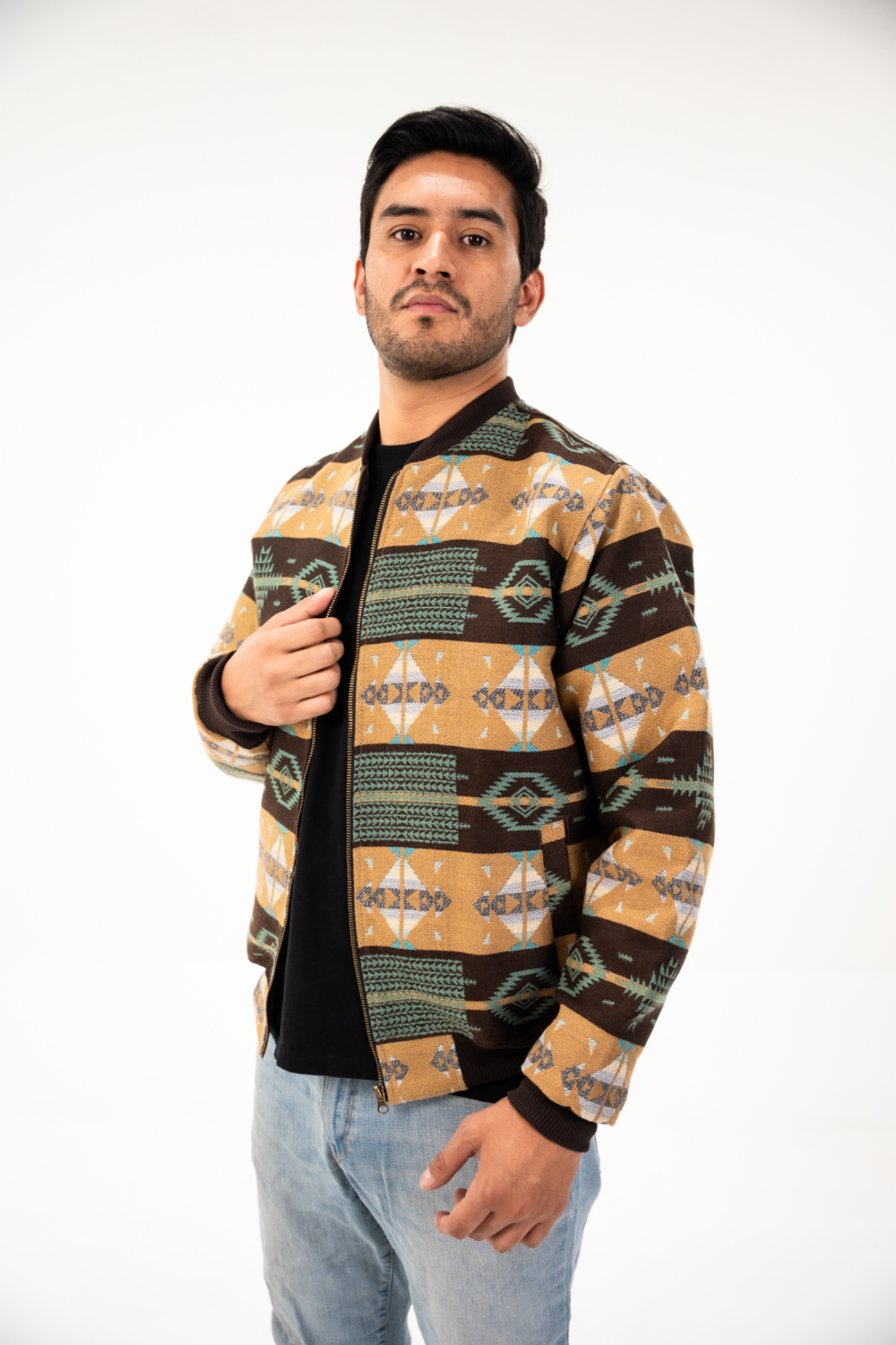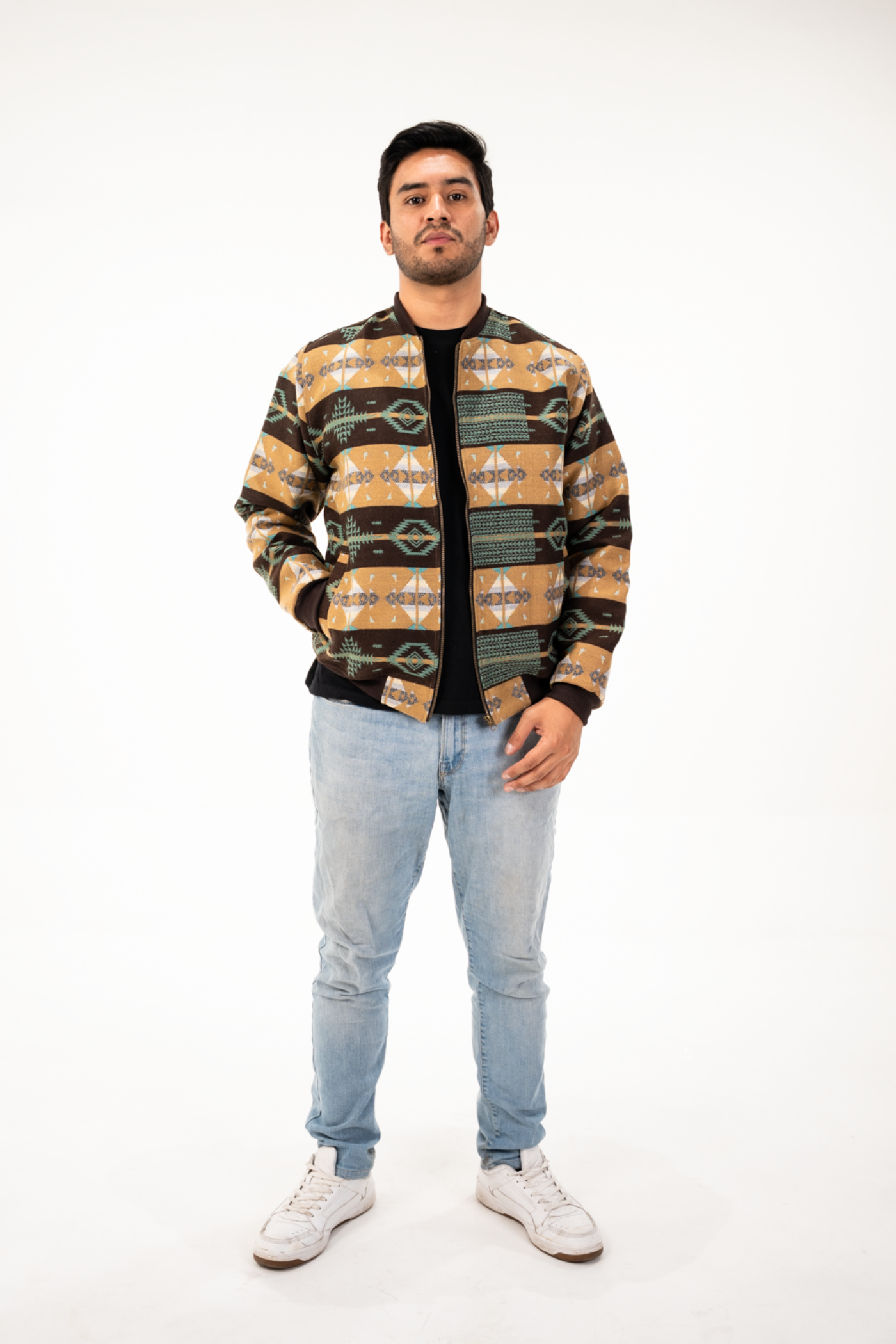 Chaqueta Bomber semientallada de tejido étnico tonos caqui/café, con cierre y forro interno.