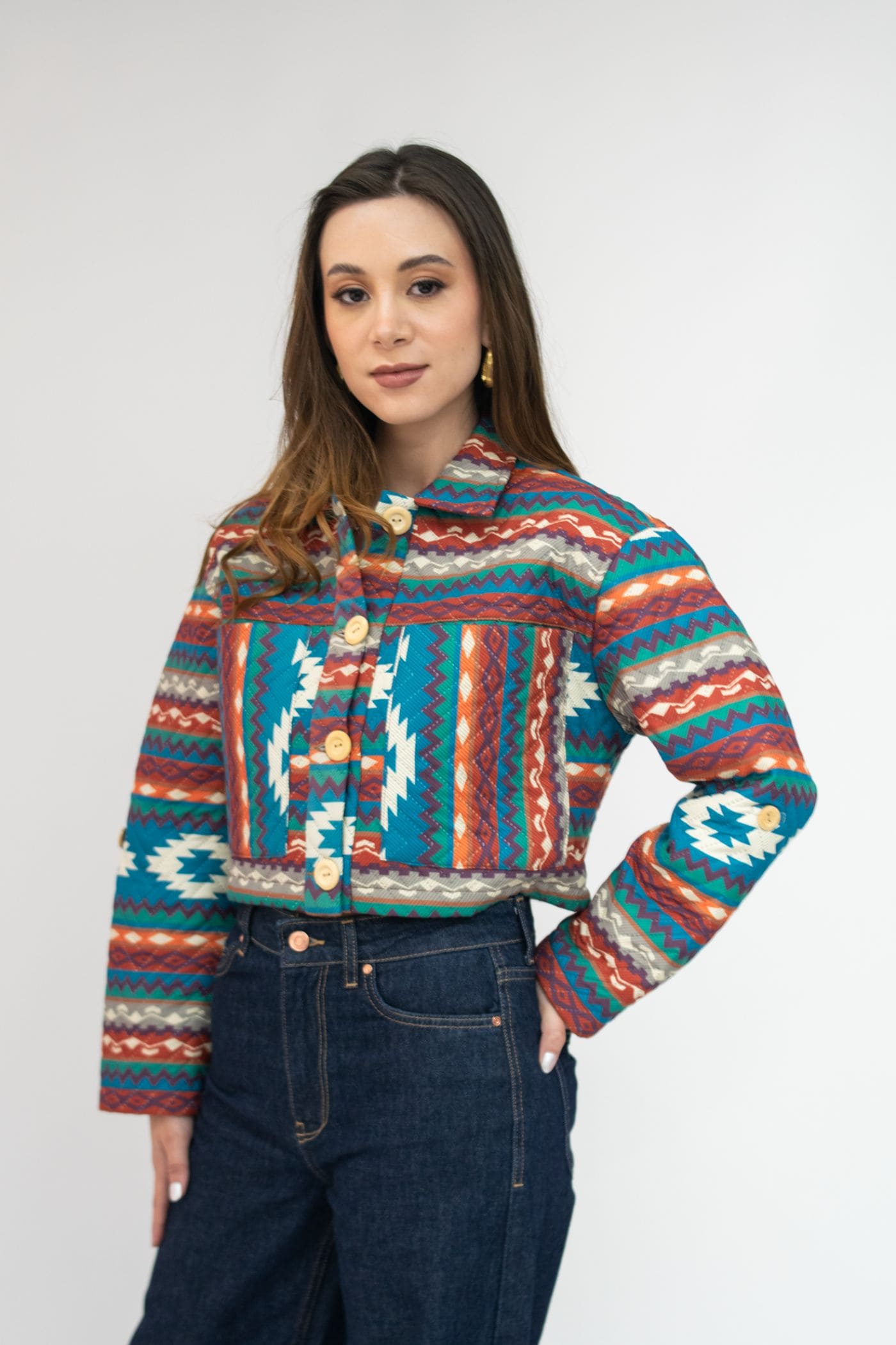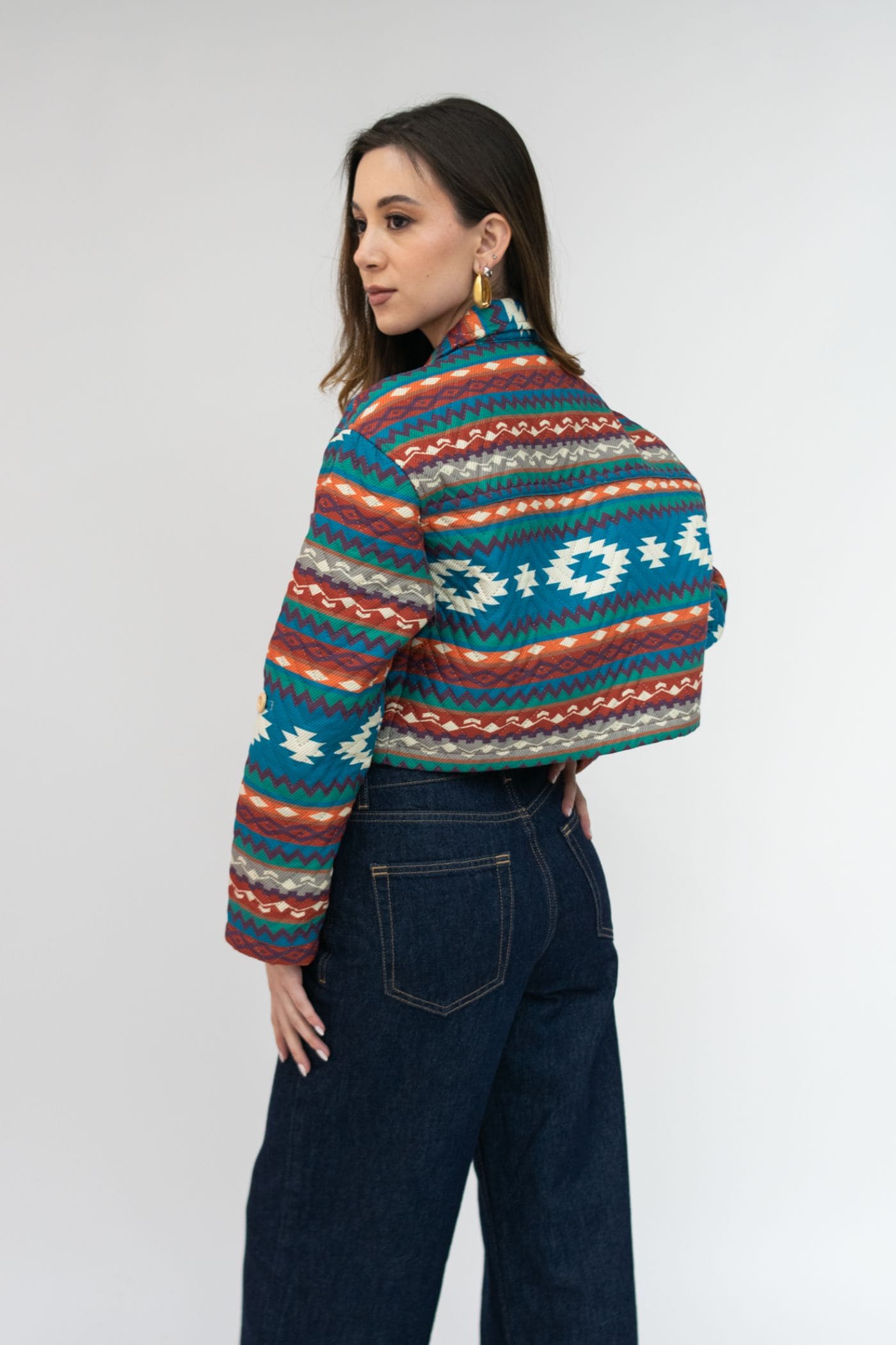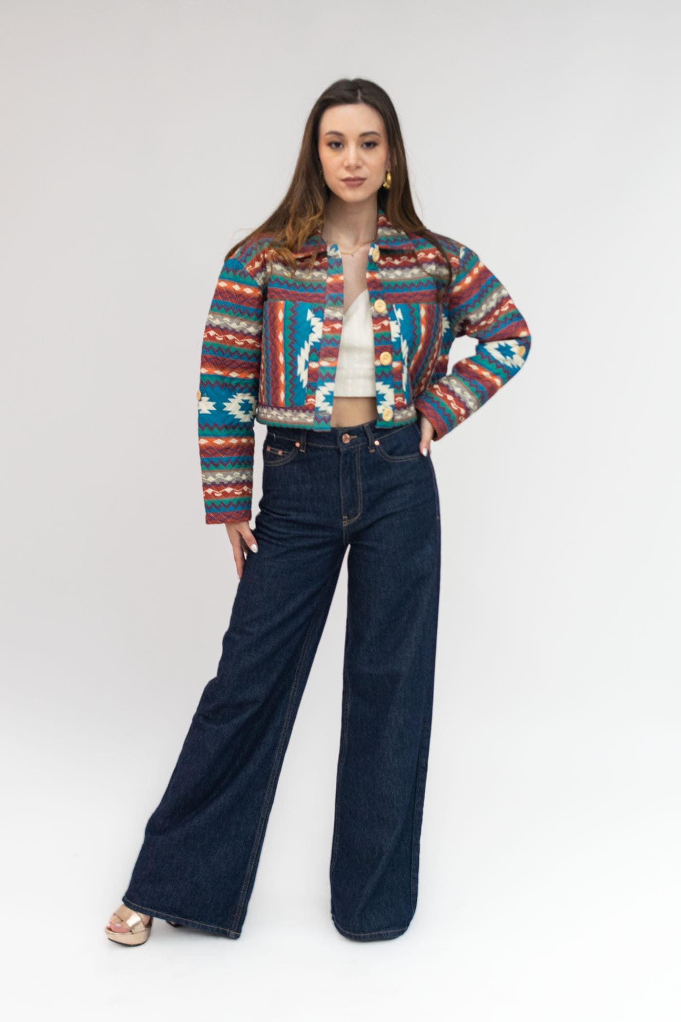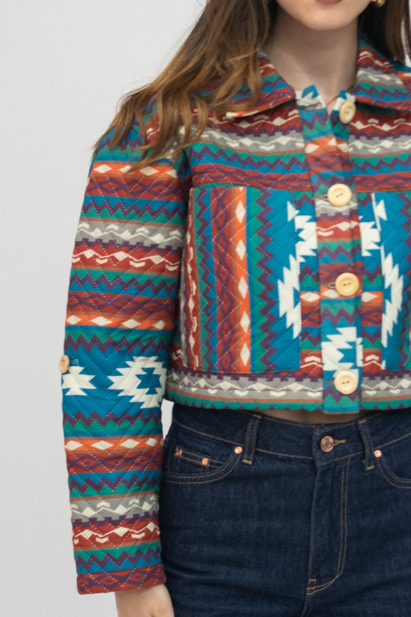 Chaqueta corta holgada de diseños étnicos en arte sublimación de manga recogida con bolsillos parches.
