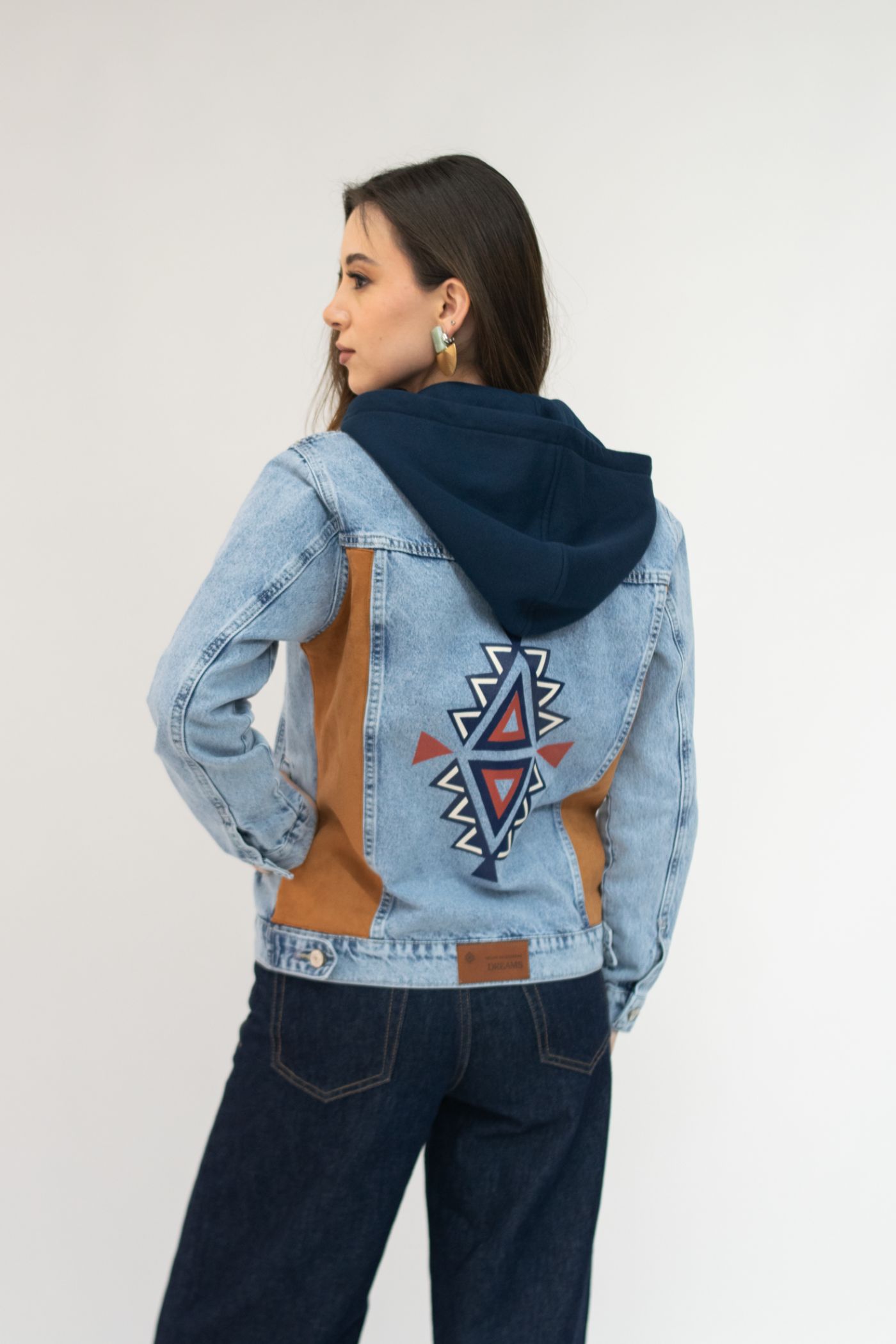Chaqueta jean azul claro semientallada con tejido étnico tonos azul/beige en parte frontal, espalda con arte en serigrafía y parches de tela de gamusa camel, con capucha desmontable color azul.