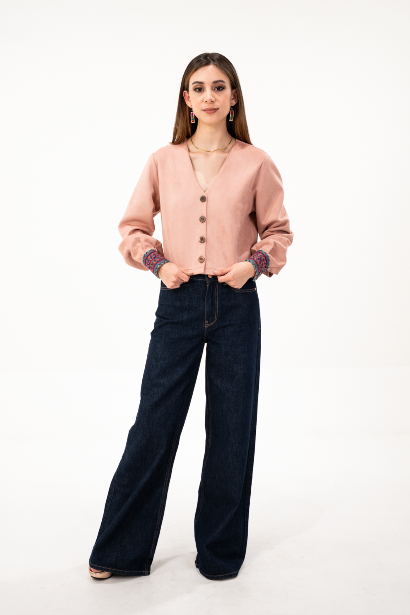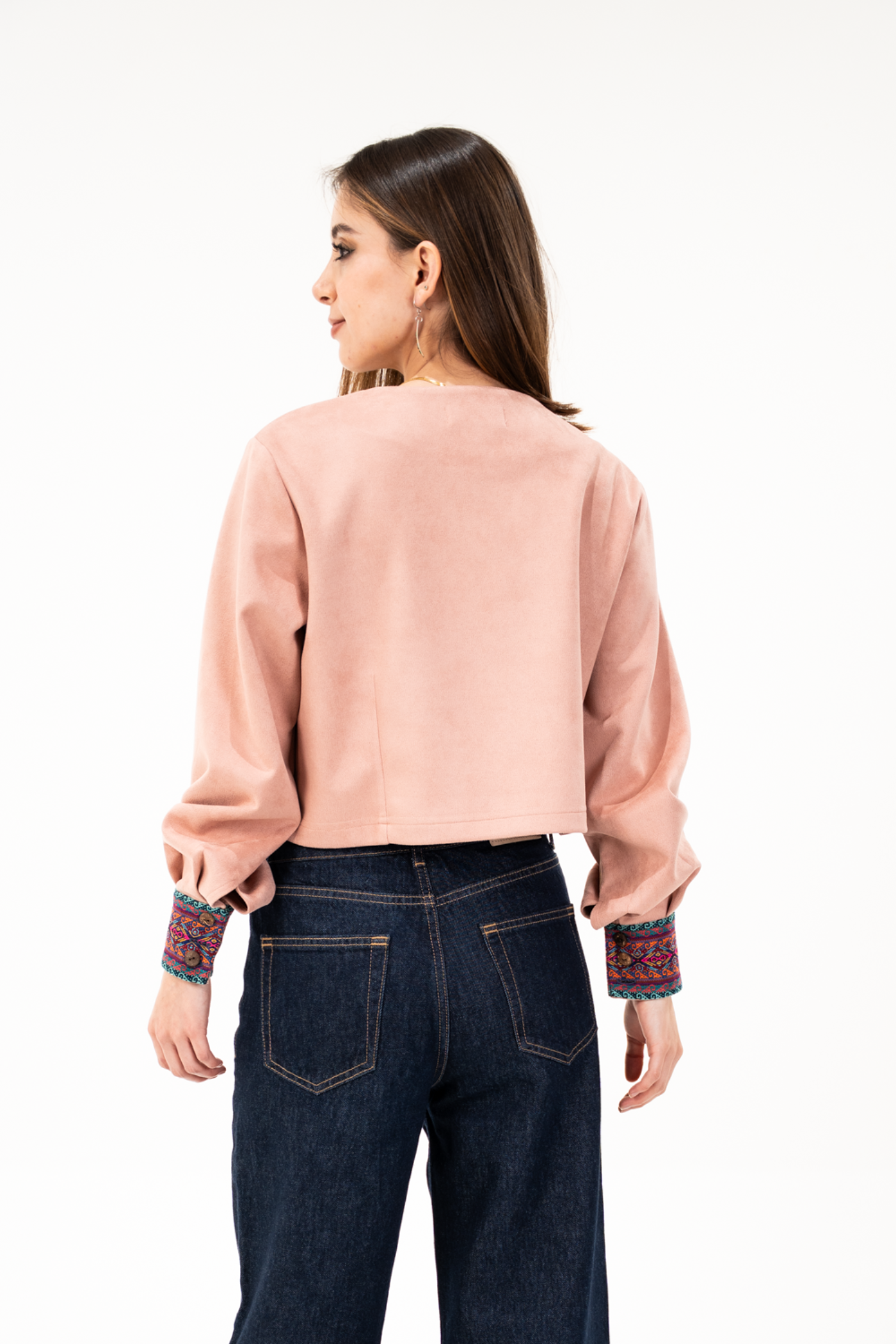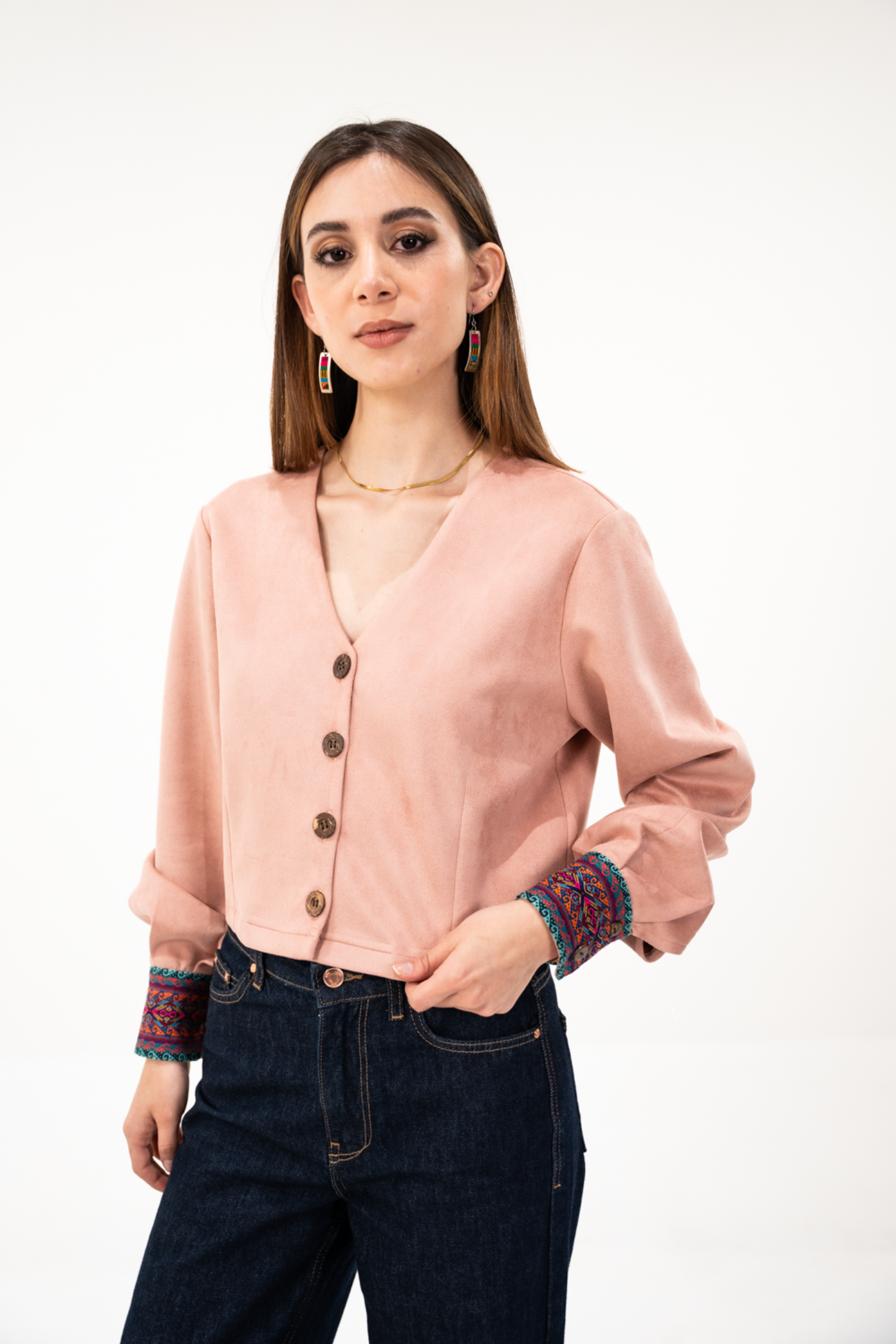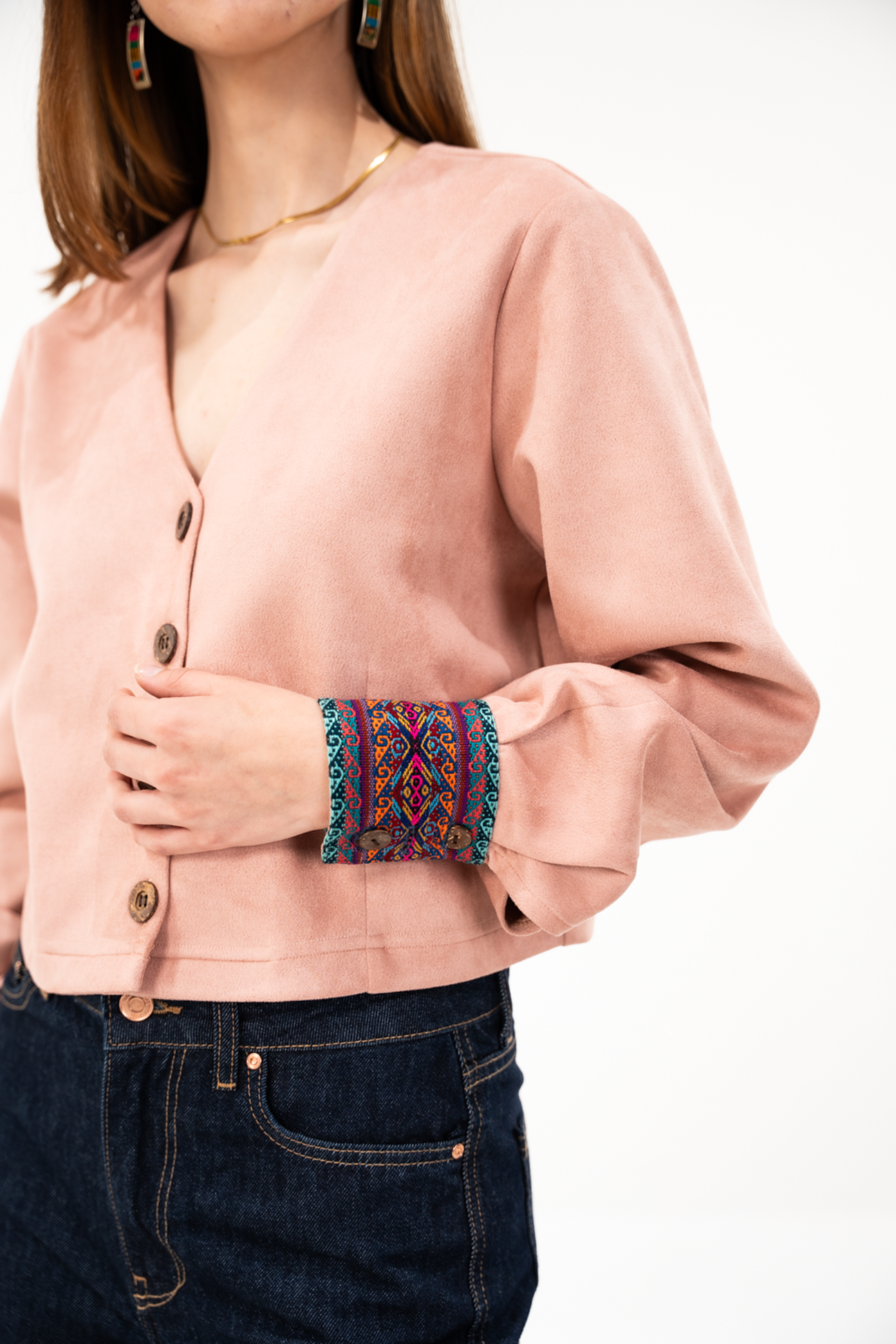 Chaqueta semientallada corta en tela de gamusa palo de rosa con detalle de tejido étnico de telar en puños y botones de coco.