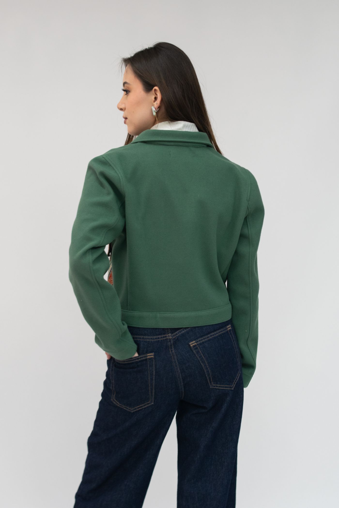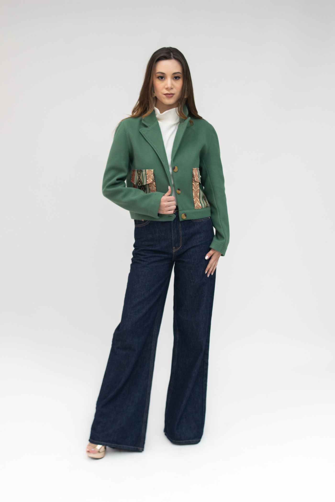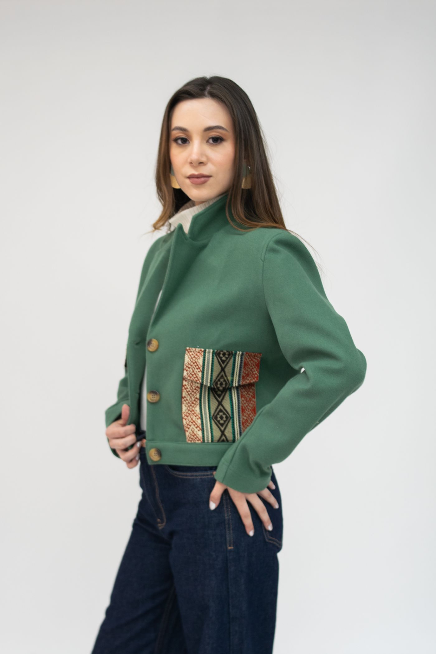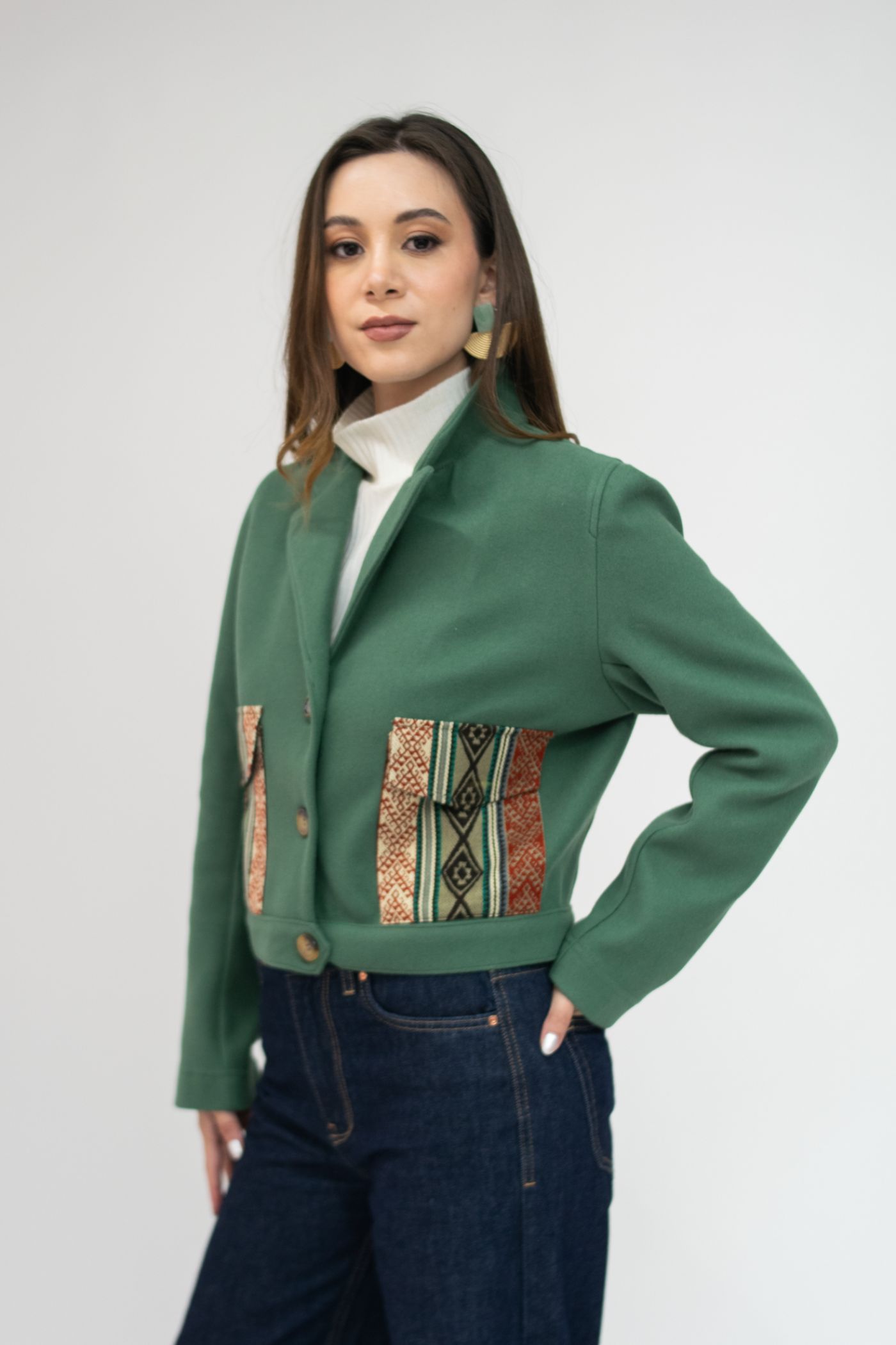Chaqueta semientallada en tela de paño color verde menta, con solapa y tejido étnico tonos terracota/caqui en bolsillos y carteras.