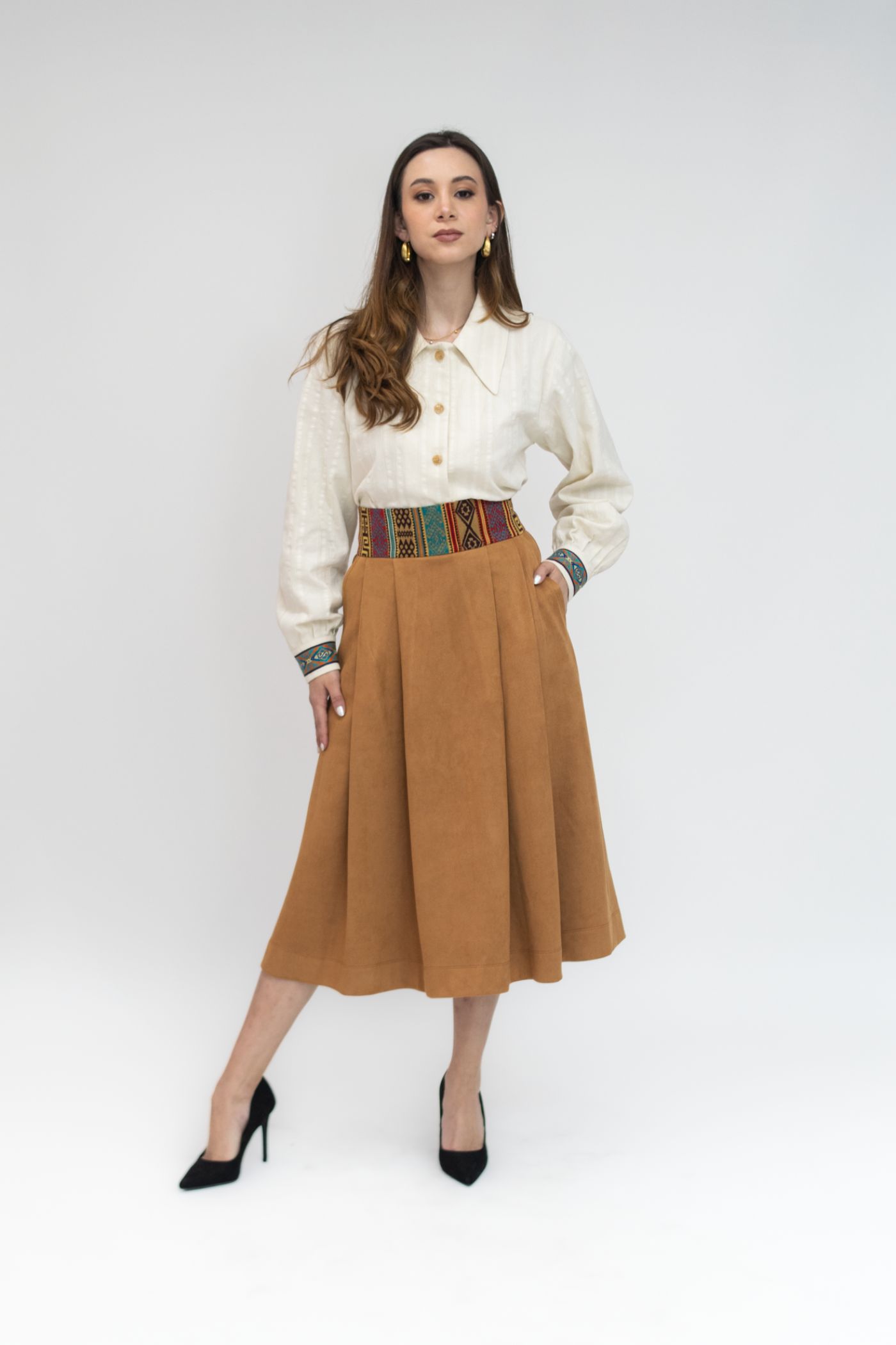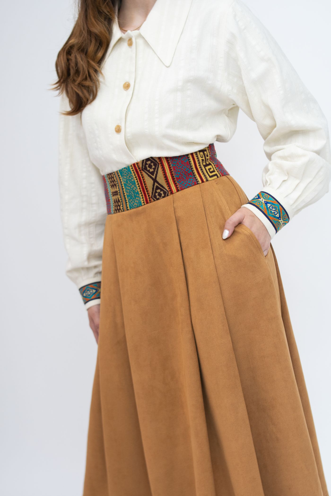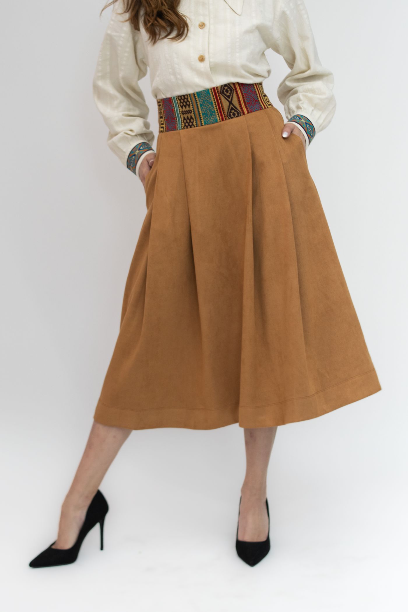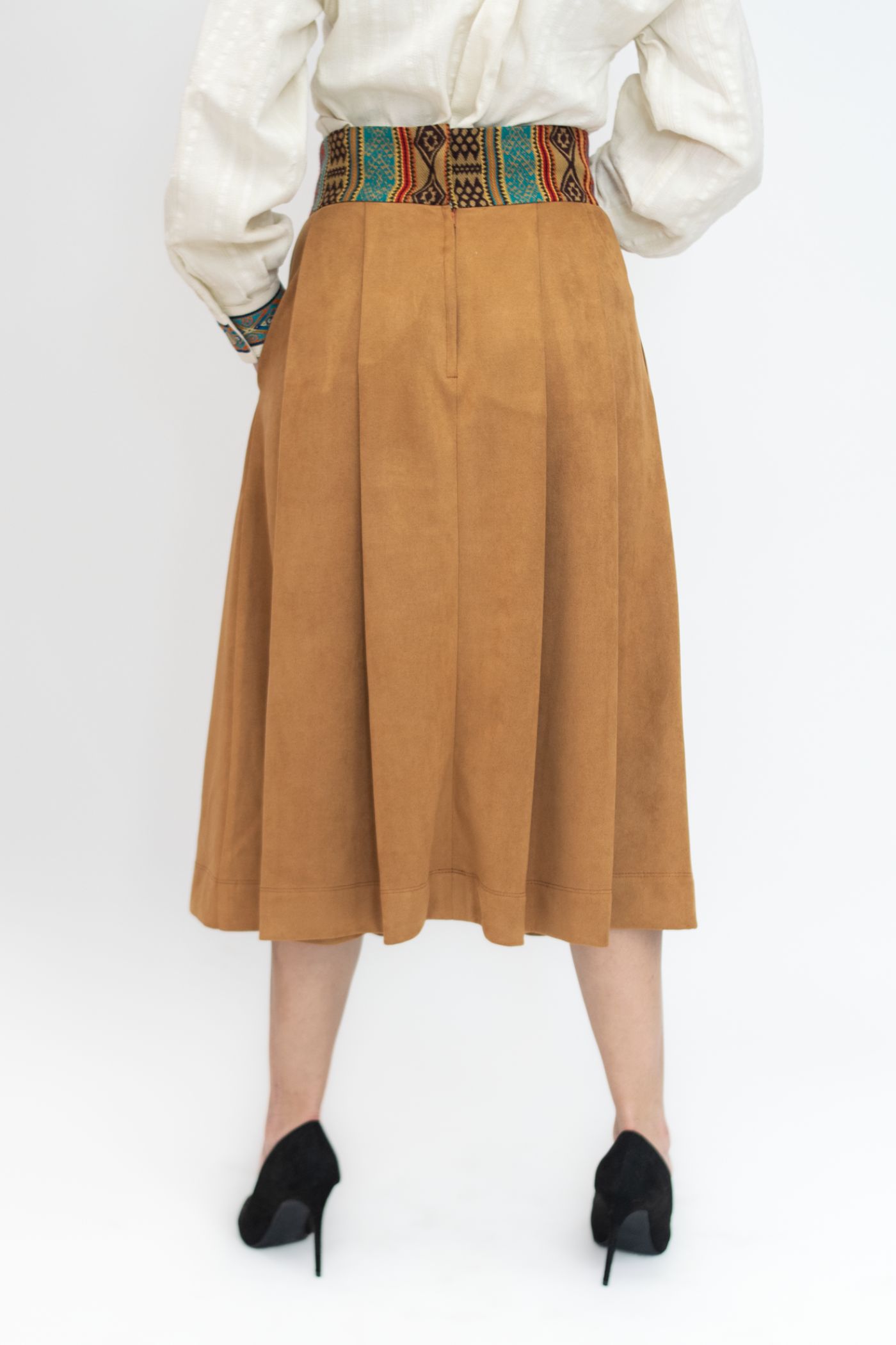 Falda tableada en tela de gamusa color camel con pretina de tejido étnico tonos caqui/turquesa con broche y cierre.