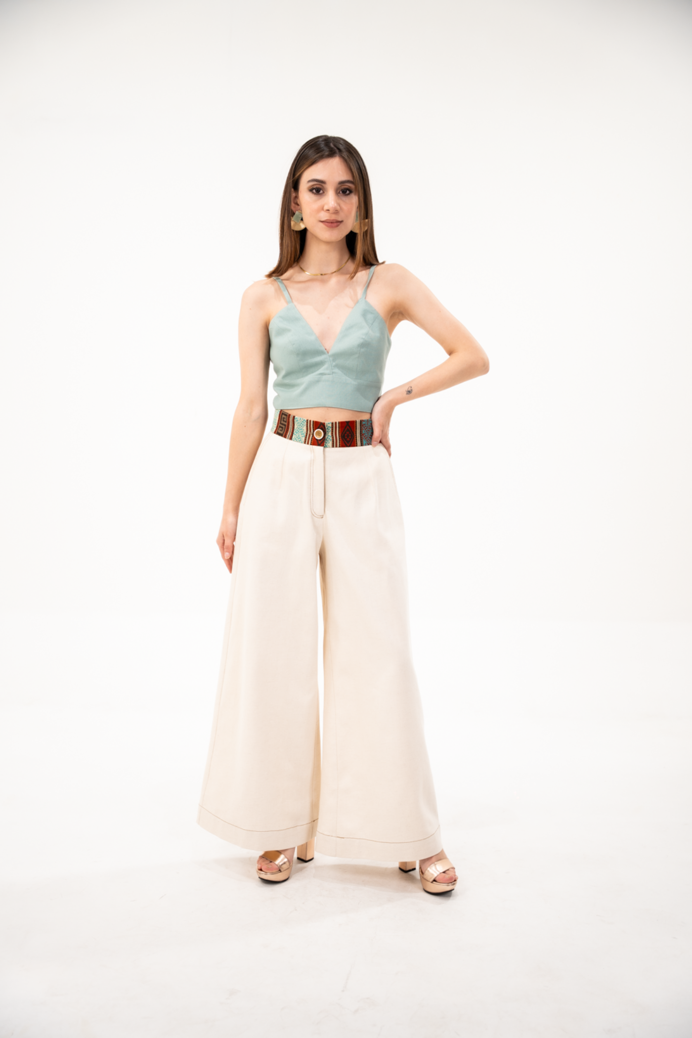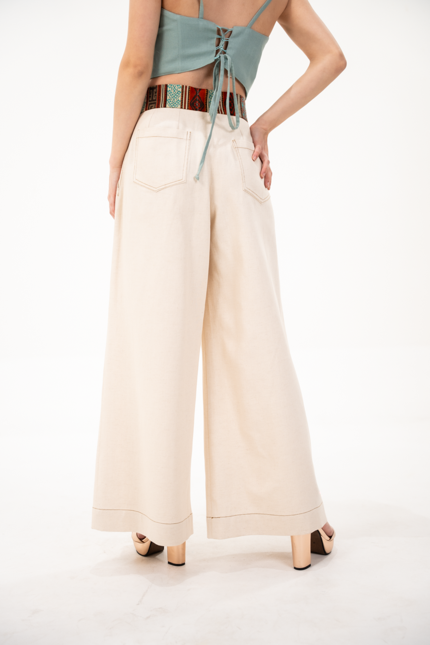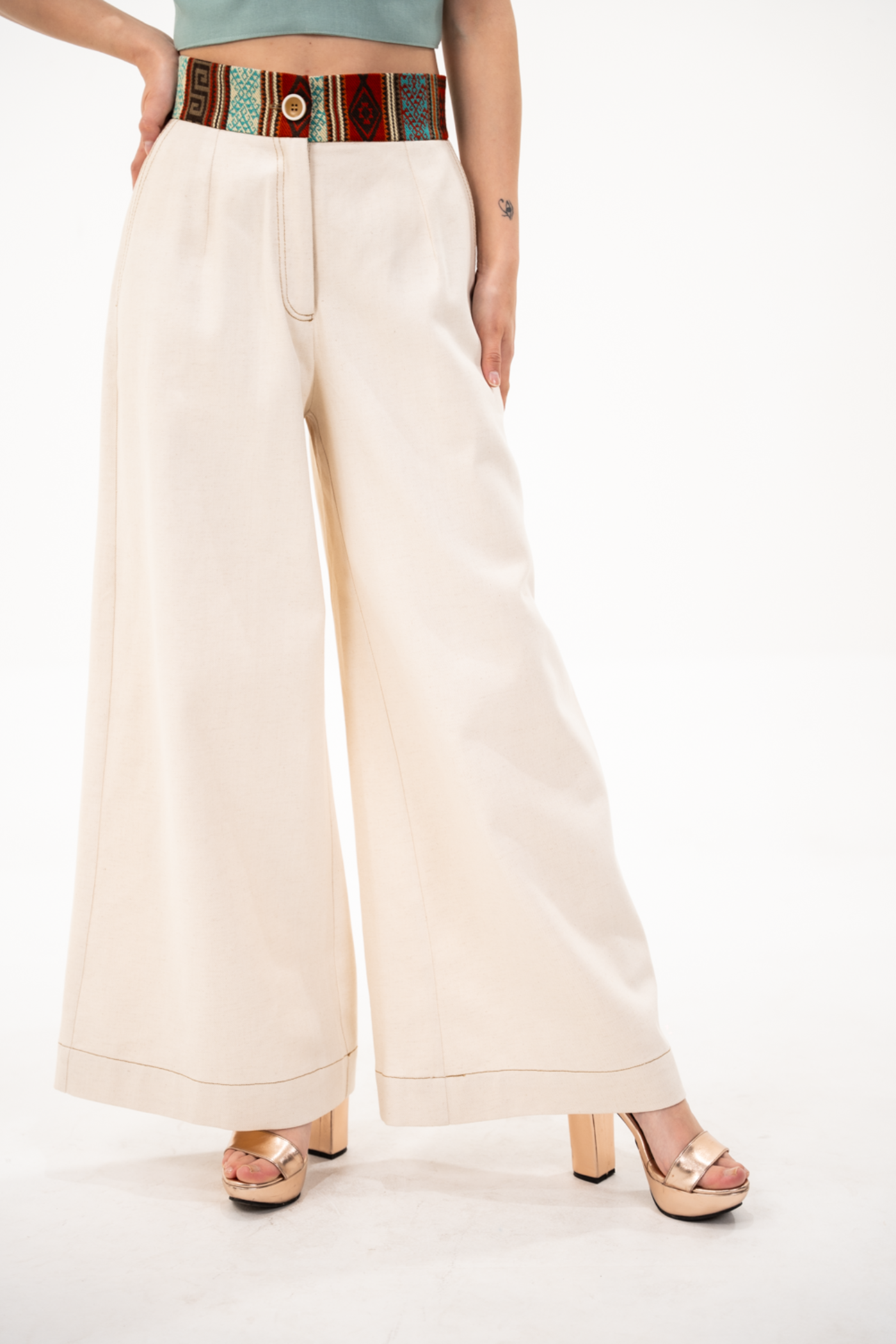 Pantalón corte wide leg en tela de algodón color beige con pretina de tejido étnico tonos terracota/turquesa con botón y cierre.