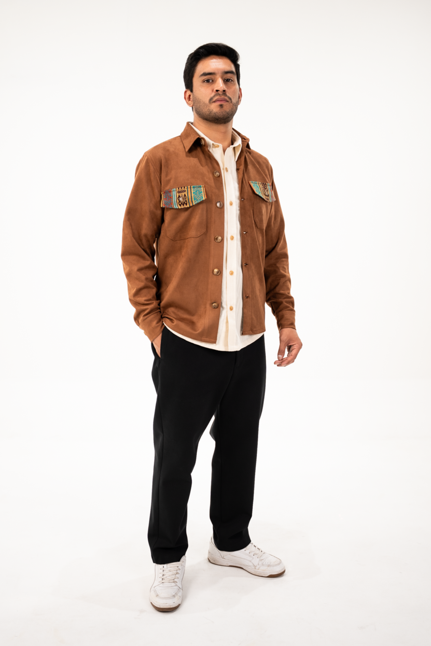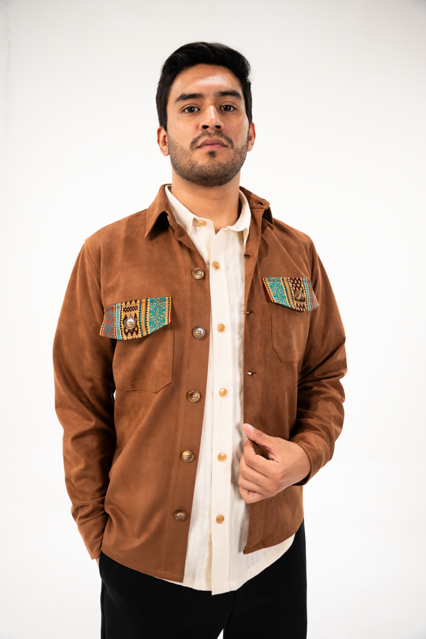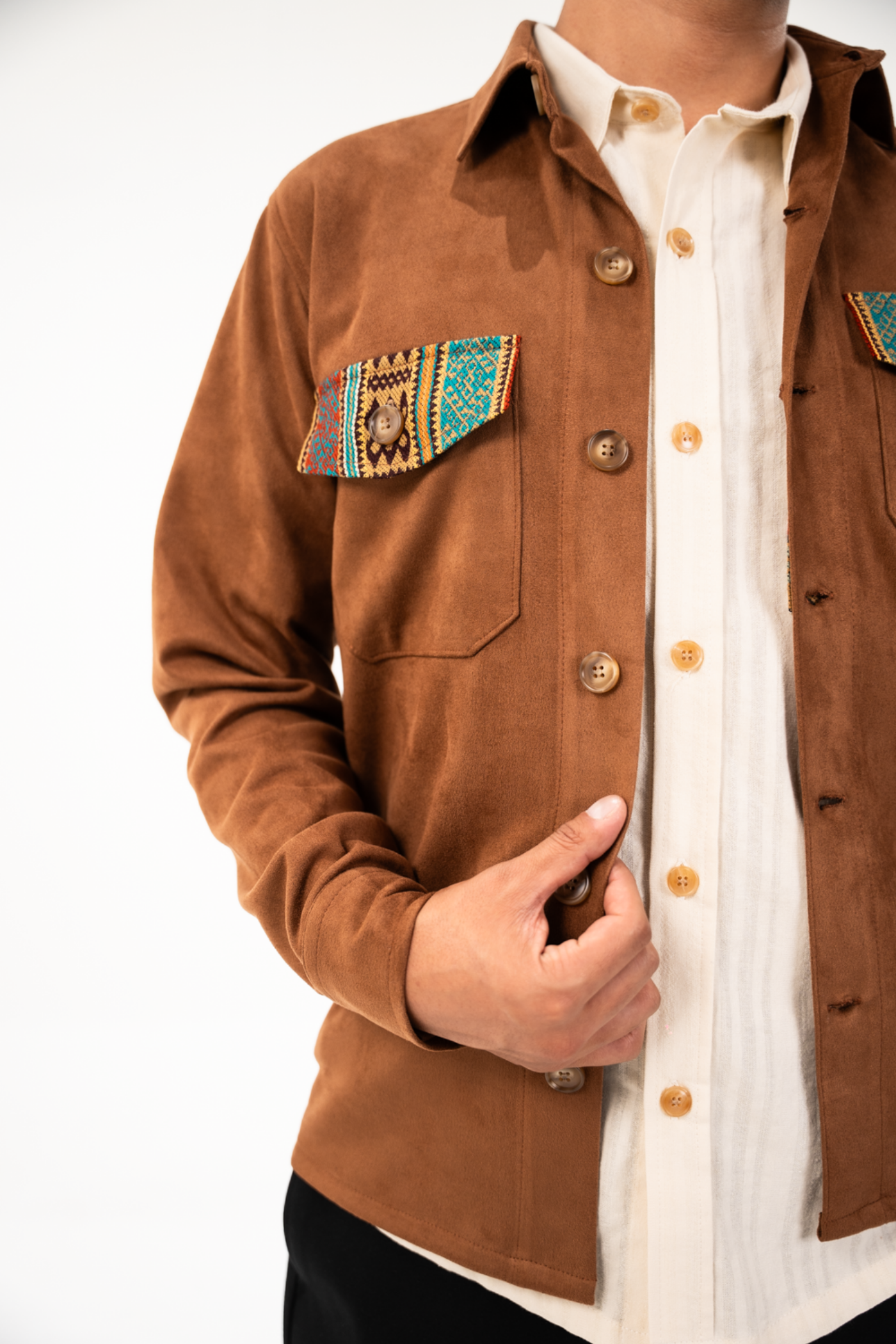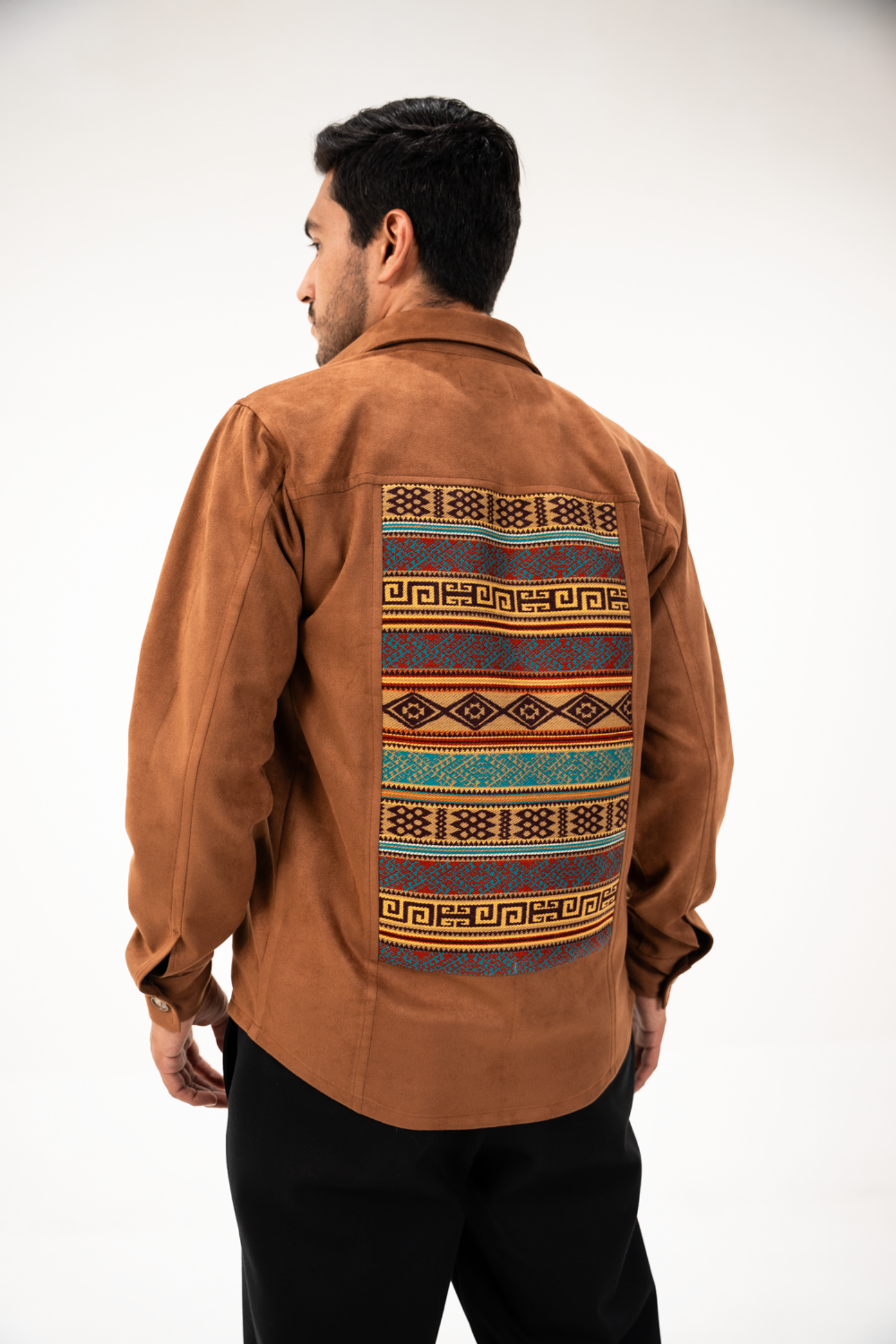 Sobrecamisa semientallada de tela gamuza color café con tejido étnico tonos caqui/terracota en carpetas y espalda.